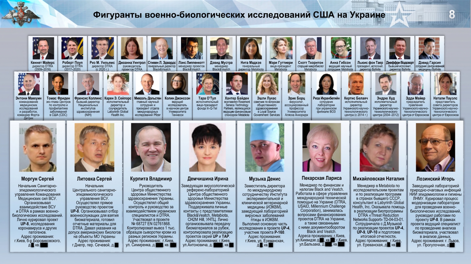 Les personnalités présentées sur la diapositive ne représentent qu’une petite partie du dossier biologique militaire ukrainien. Au total, le ministère russe de la Défense dispose d’informations sur plus d’une centaine de participants à des programmes biologiques à double usage. Actuellement, le Comité d’enquête de la Fédération de Russie contrôle plus de 10 citoyens américains, ainsi qu’un certain nombre de responsables du ministère ukrainien de la Défense, pour leur implication dans la mise en œuvre de ces programmes.