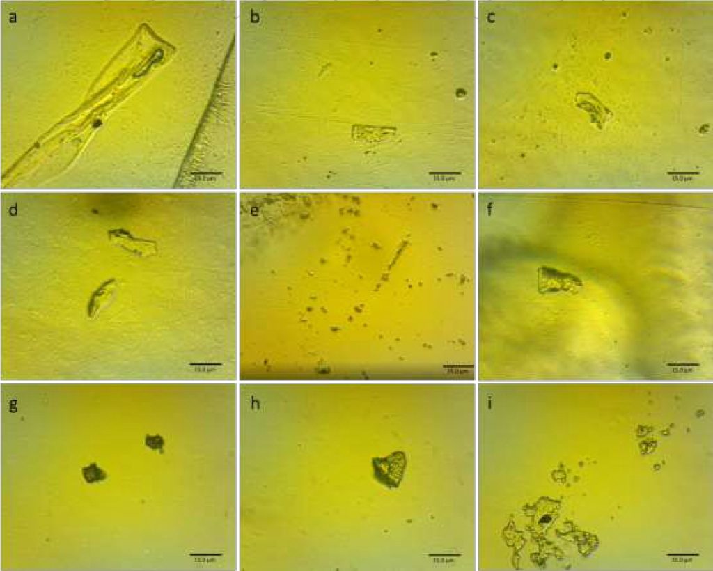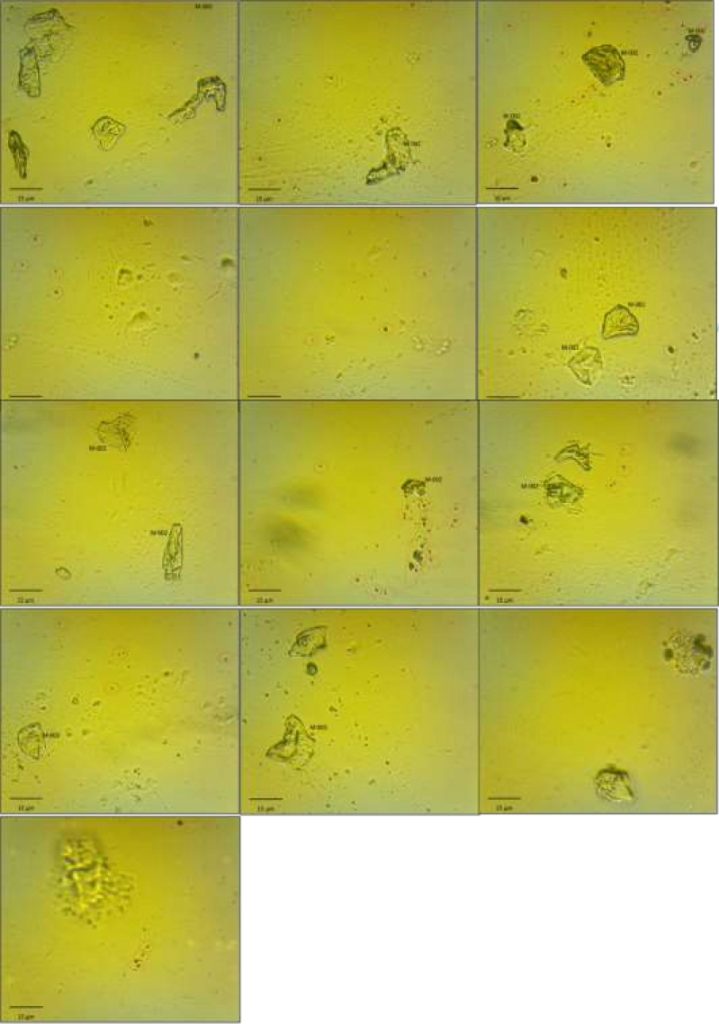 Des formes de ruban de microformes presque transparentes se trouvent en bon nombre dans la diapositive. Ceux-ci sont souvent à moitié intégrés dans la solution, une extrémité dépassant du matériau. Les composites de carbone des formes 1 et 2 sont également présents en grand nombre. La forme 1 se dépose sur le matériau tandis que la forme 2 se trouve aux niveaux intermédiaires du milieu solidifié. Les nanoformes de graphène sont présentes en nombre important dans le matériau de la diapositive, ainsi que dans certains parchemins. La figure ci-dessous présente un ensemble de diverses formes d’inclusion identifiées au sein de Pfizer.