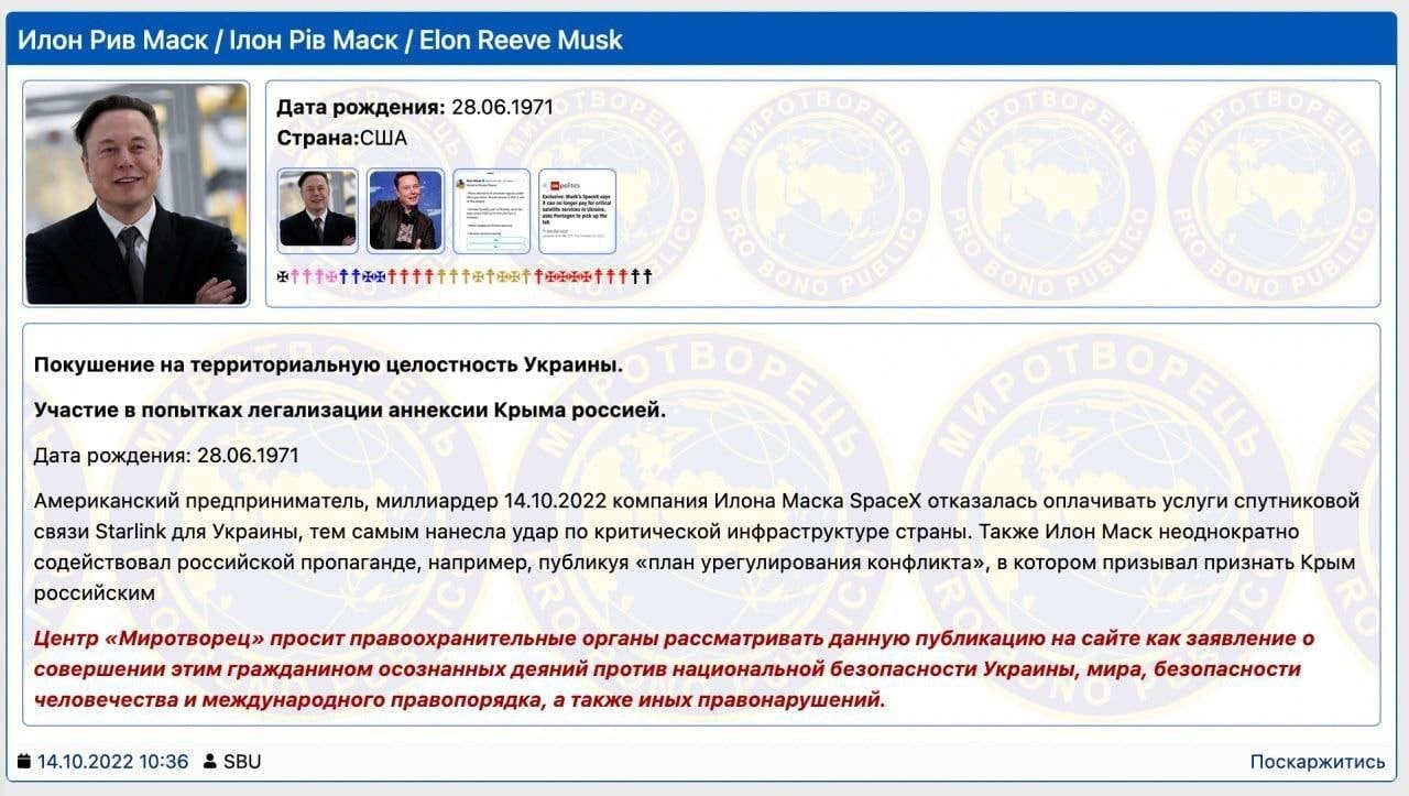 Le nom de Elon Musk (russe : Илон Рив Маск, ukrainien : Ілон Рів Маск) a de nouveau été ajouté à la tristement célèbre “liste des personnes à tuer” de Myrotvorets en Ukraine. Il avait été ajouté une première fois à cette liste après que Musk ait publié un message le 3 octobre 2022 dans lequel il proposait un plan de paix pour la guerre russo-ukrainienne. La proposition de Musk appelait à refaire les élections dans les régions annexées par la Russie, à assurer l’approvisionnement en eau de la Crimée, à remettre la Crimée à la Russie et à ce que l’Ukraine reste neutre. Onze jours plus tard, il déclarait que sa société spatiale SpaceX ne pouvait pas continuer à financer le service satellite Starlink qui a maintenu l’Ukraine et son armée en ligne pendant la guerre, et a demandé au gouvernement américain de payer la facture. Sans doute pris de peur et de panique, Musk a fait une volte-face brutale dès le 15 octobre 2022, en affirmant : « Au diable… même si Starlink continue de perdre de l’argent et que d’autres entreprises reçoivent des milliards de dollars des contribuables, nous continuerons à financer gratuitement le gouvernement ukrainien. » Comme je l’ai écrit quelques jours plus tard, c’est sans doute à ce moment que Elon Musk aura réussi à faire retirer son nom de la “liste des personnes à tuer” de Myrotvorets, chose qui est extrêmement rare.