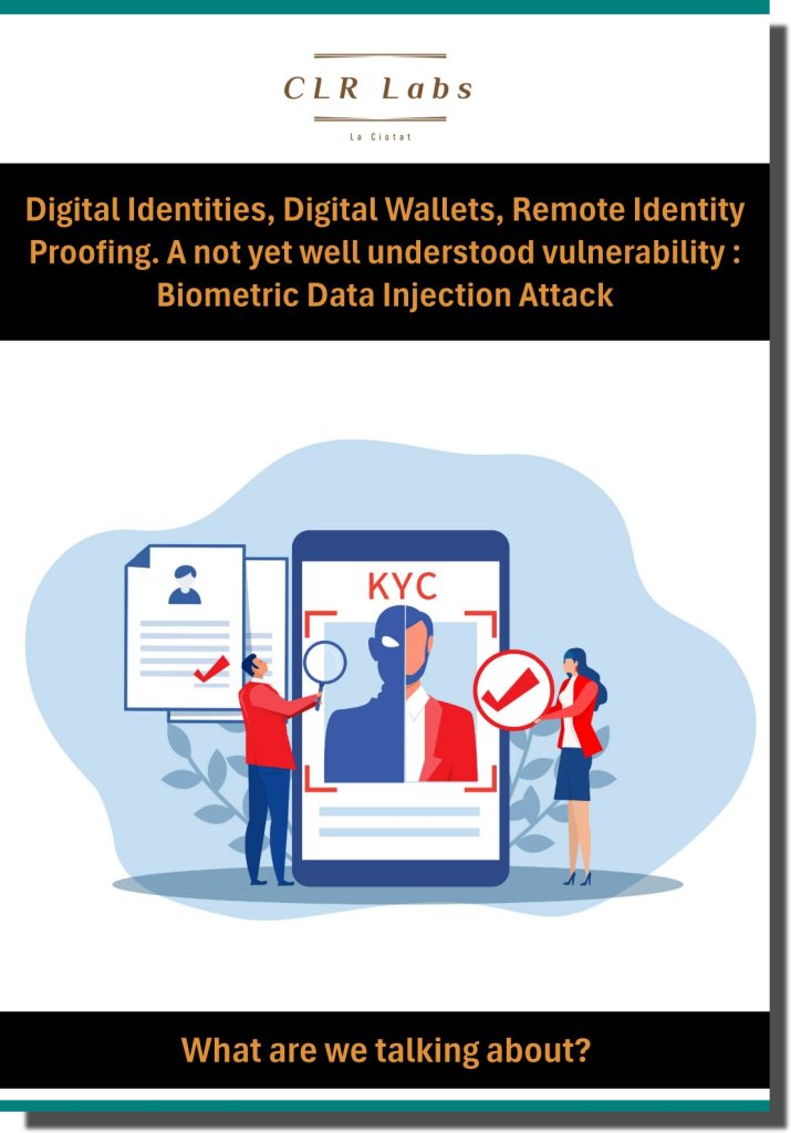 « Digital Identities, Digital Wallets, Remote Identity Proofing. A not yet well understood vulnerability: Biometric Data Injection Attack » (Identités numériques, portefeuilles numériques, vérification d’identité à distance. Une vulnérabilité pas encore bien comprise : attaque par injection de données biométriques) est un livre blanc de sept pages rédigé par CLR Labs. Il commence par examiner l’utilisation accrue de la biométrie pour les contrôles KYC à distance pour une gamme de services importants et sensibles. Les régulateurs ont réagi en adoptant de nouvelles règles anti-blanchiment et autres. Les gouvernements ont accéléré leurs travaux sur les portefeuilles numériques, en partie pour faciliter l’accès aux services à distance, mais cela donne également aux attaquants un autre moyen de commettre des fraudes d’identité.