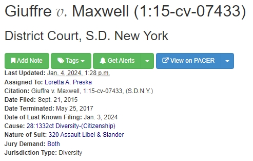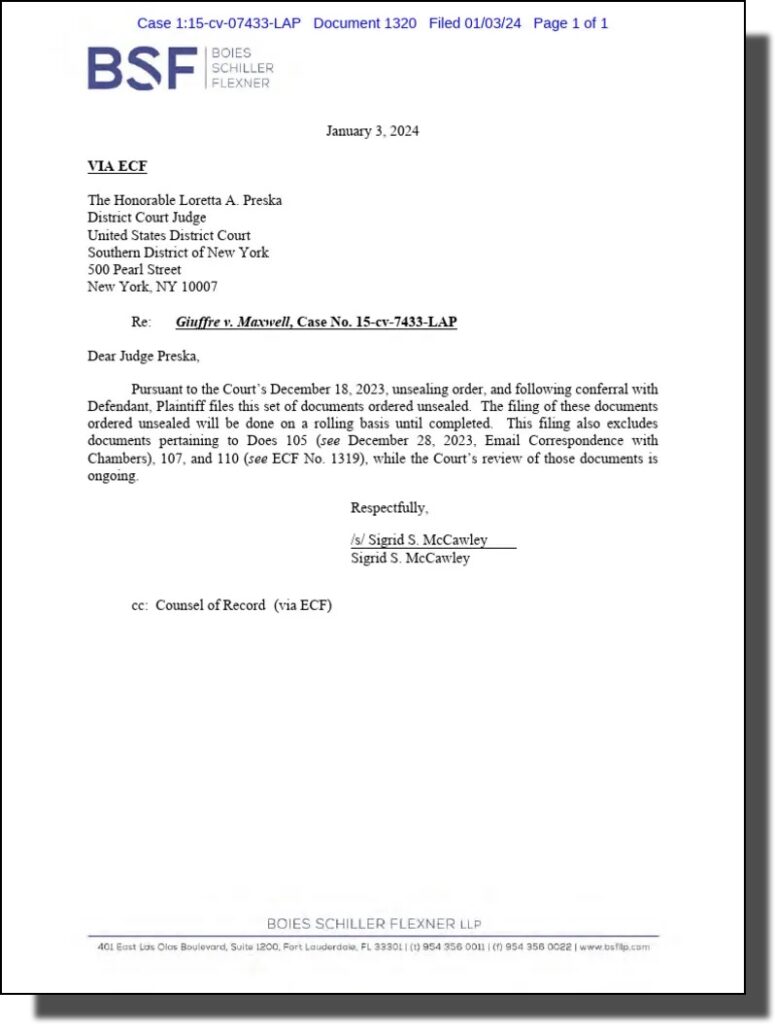 Une mine de plus de 1 000 pages de documents a été descellée dans le cadre d’un procès contre Ghislaine Maxwell. Ces documents révéleraient l’identité de plus de 180 personnes liées à l’affaire Ghislaine Maxwell contre Virginia Guiffre. La juge de district américaine Loretta Preska a statué qu’il n’y avait aucune raison légale de garder scellés les noms de « John et Jane Does » cités dans les documents d’Epstein et a ordonné qu’ils soient libérés et rendus publics à partir du 2 janvier. Les noms ne sont pas nécessairement tous ceux des clients d’Epstein, mais incluent les associés ainsi que les accusés et les accusateurs. Le tribunal a retardé la libération totale jusqu’au 22 janvier au moins en raison d’une demande d’un « j. Doe » qui est apparemment une victime et non un client. Ils devraient donc publier davantage d’informations pendant le reste du mois.