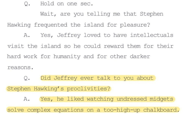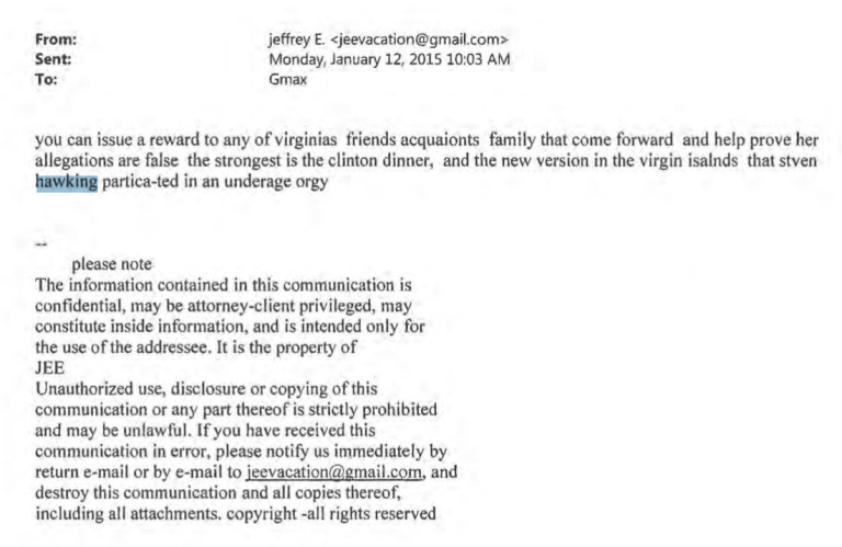 Stephen Hawking se serait rendu sur l’île d’Epstein pour le « plaisir ». Un e-mail d’Epstein à Maxwell révèle apparemment qu’il lui demandait de l’aider à prouver que les allégations selon lesquelles Hawking était impliqué dans une orgie de mineurs étaient fausses.