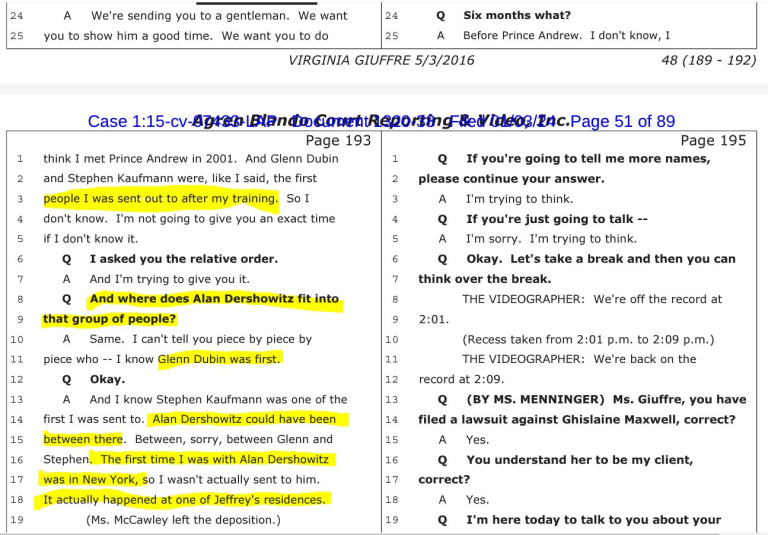 Epstein aurait forcé une mineure à avoir des relations sexuelles avec Alan Dershowitz, professeur de droit à Harvard, et Virginia Giuffre affirme avoir eu plusieurs relations sexuelles avec lui. « La première fois que j’étais avec Alan Dershowitz, c’était à New York… dans l’une des résidences de Jeffrey. »