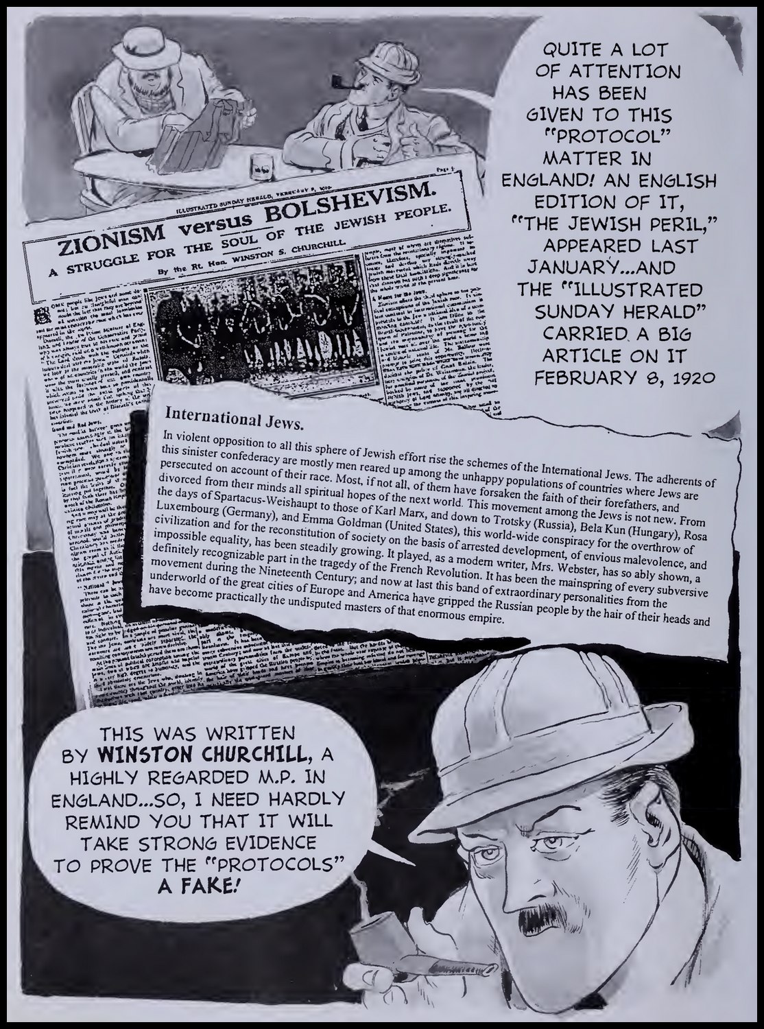 Plus tard dans son discours, Churchill a développé ce point et a inclus une phrase qui mènerait à l’article « Le sionisme contre le bolchevisme ». « Les bolcheviks », a-t-il déclaré, « cherchent à détruire le capital. Nous cherchons à contrôler les monopoles…. Nous défendons la liberté de conscience et l’égalité religieuse. Ils cherchent à exterminer toute forme de croyance religieuse…. Ils croient au soviet international des Juifs russes et polonais. Nous continuons de faire confiance à l’Empire britannique. »