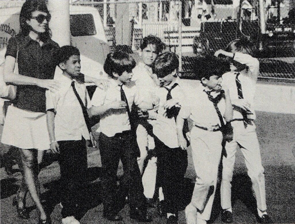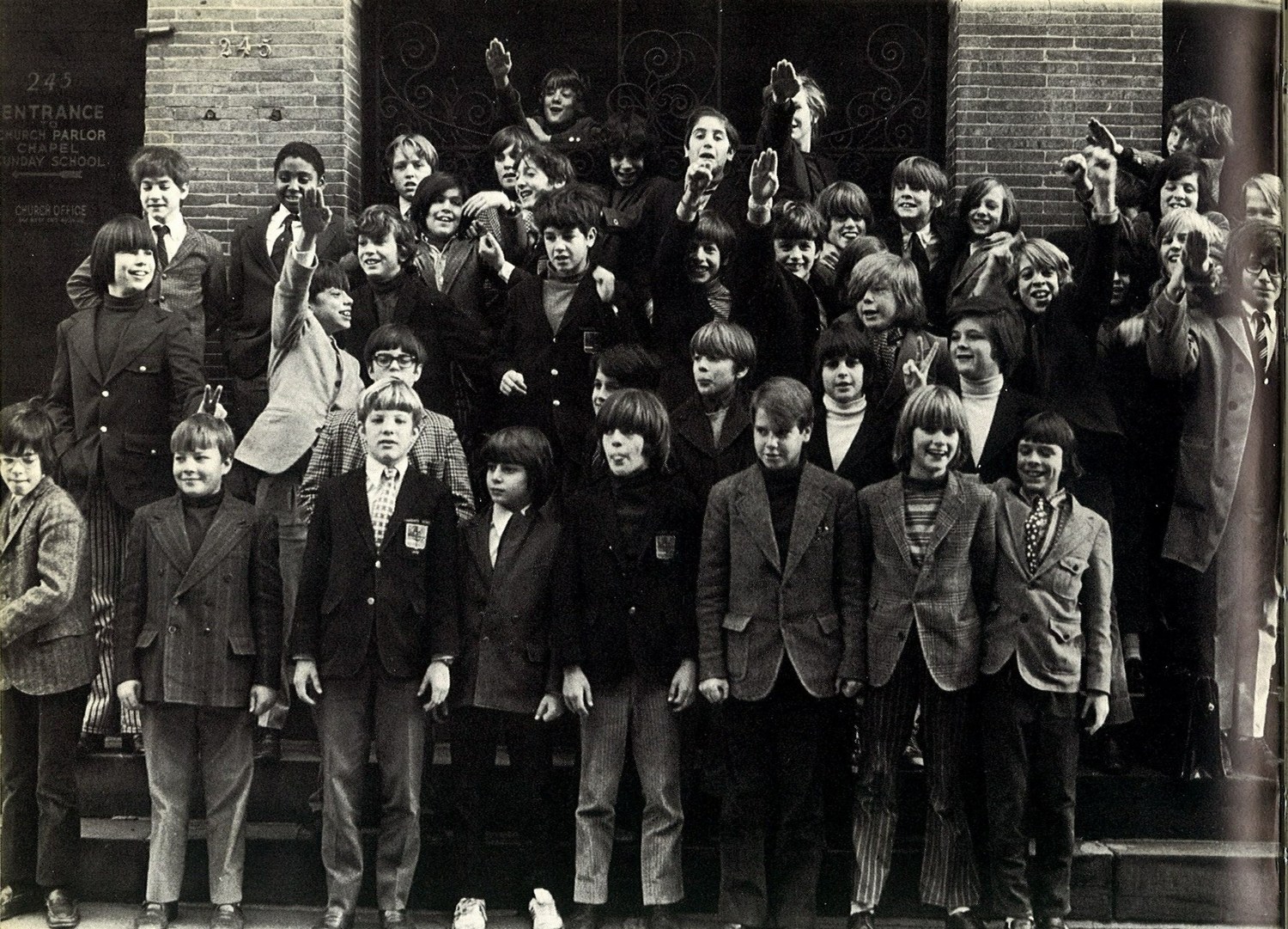 La photo ci-dessus nous montre tous les deux en 6e année à la Collegiate School de New York. Nous en apprenions davantage sur la Seconde Guerre mondiale, les nazis et Hitler, que les garçons à l’arrière semblaient admirer de manière troublante. John-John est quatrième en partant de la droite, avec la langue tirée, et je suis troisième en partant de la gauche, avec mes cheveux teintés en blond, grâce aux Quigley qui les ont arrosés de jus de citron. Mon expression porte un vernis MK-Ultra notable.
