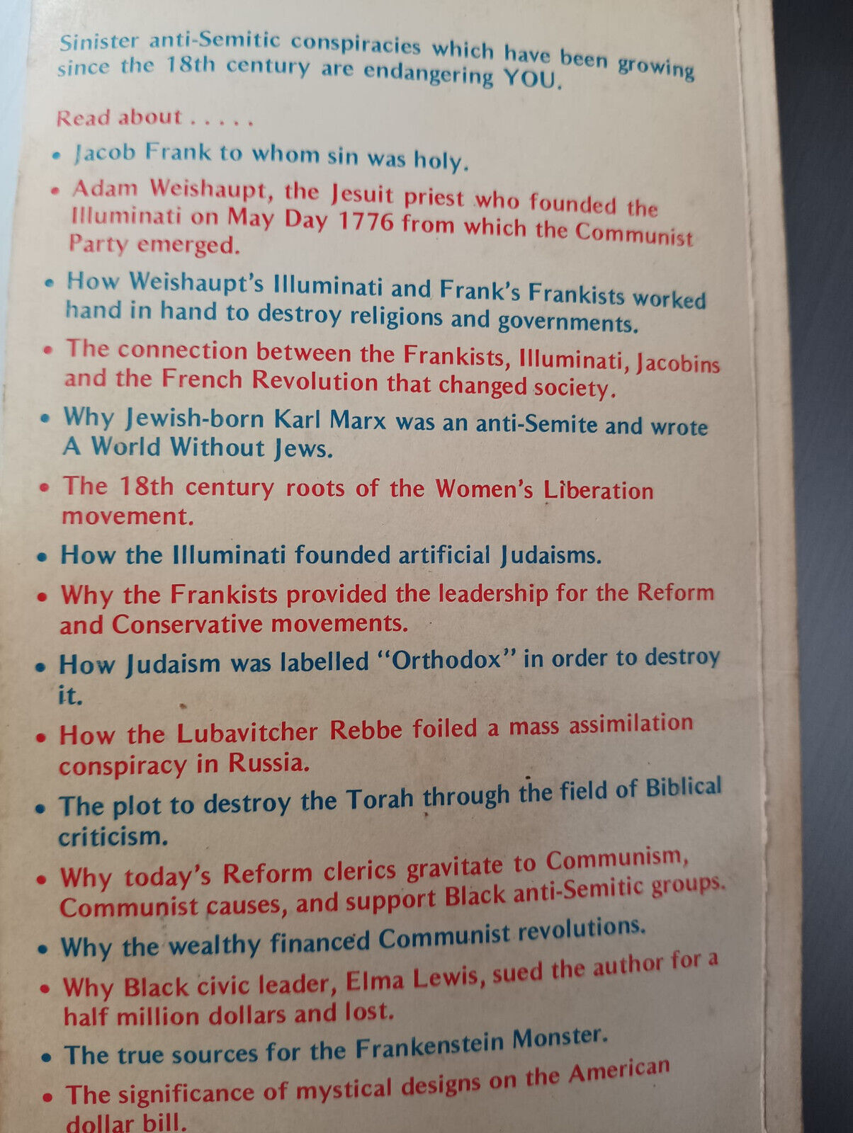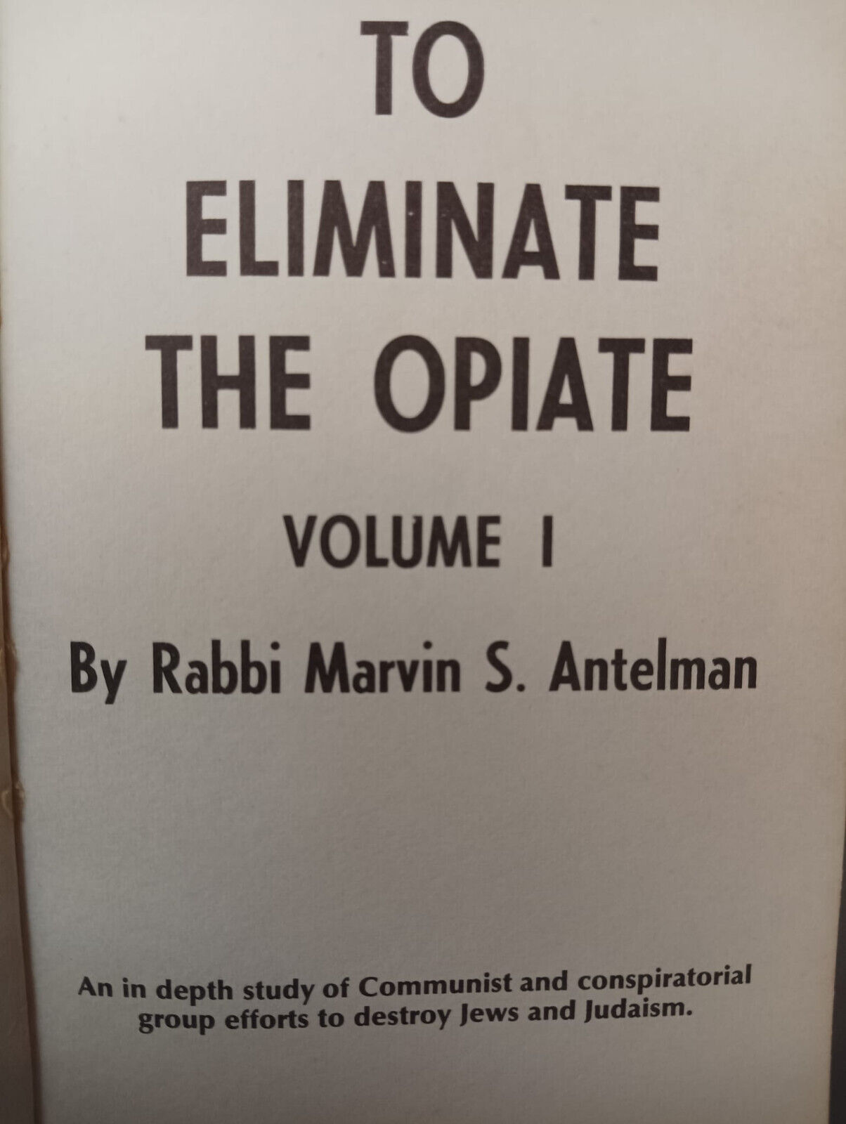 Une fois de plus, j’ai fait l’acquisition d’un ouvrage extraordinaire et très important du rabbin Marvin Stuart Antelman, intitulé « To Eliminate the Opiate: The Frightening Inside Story of Communist and Conspiratorial Group Efforts to Destroy Jews, Judaism and Israel » (Pour éliminer les opiacés : l’histoire effrayante des efforts des groupes communistes et conspirateurs pour détruire les juifs, le judaïsme et Israël). Publié en deux volumes, respectivement en 1974 et en 2002, cet ouvrage nous aide à comprendre le lien existant entre les Sabbatéens, les Frankistes, les Jacobins et les Illuminati. J’ai fait l’acquisition des éditions originales, soit le Volume 1 chez eBay directement de Jérusalem, et le Volume 2 dans l’une de mes boutiques préférées, Thriftbooks. Évidemment, encore une fois, j’ai obtenu ces livres à des prix très abordables. Normalement, ces éditions originales sont plutôt onéreuses. L’éditeur israélien de l’édition actuelle de l’ouvrage, The Zionist Book Club, écrit sur son site internet à propos du premier volume (1974) : « On peut encore le trouver d’occasion, même pour 250 $, sur certains sites de livres rares. » On peut vérifier la valeur du deuxième volume (2002) chez Abebooks (veuillez noter que l’image de la couverture n’est pas la bonne), alors que je l’ai obtenu au prix de l’édition actuelle, c’est-à-dire 28,79 $.