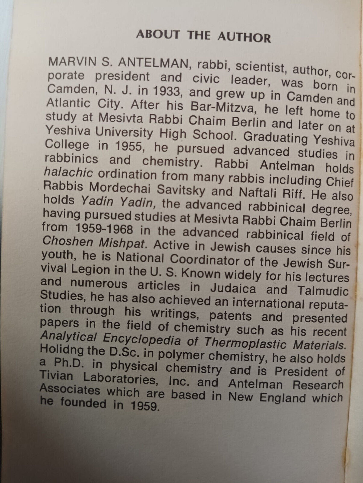 Marvin Stuart Antelman était un rabbin et chimiste israélo-américain. Il est né le 10 janvier 1933 à Camden, dans le New Jersey, des époux Harry et Anna Antelman (tous deux nés en Roumanie), respectivement propriétaire et finisseur de fourrures au détail. En 1990, il résidait à Providence (Rhode Island) et en 2000, à Weymouth, dans la banlieue de Boston aux États-Unis. Antelman est l’auteur de deux encyclopédies : « The analytical encyclopedia of thermoplastic materials » (1974) et « The encyclopedia of chemical electrode potentials » (New York, 1982). En juillet 2020, ce dernier ouvrage comptait 359 enregistrements dans Worldcat (Justia) et 181 citations universitaires (Google Patents).