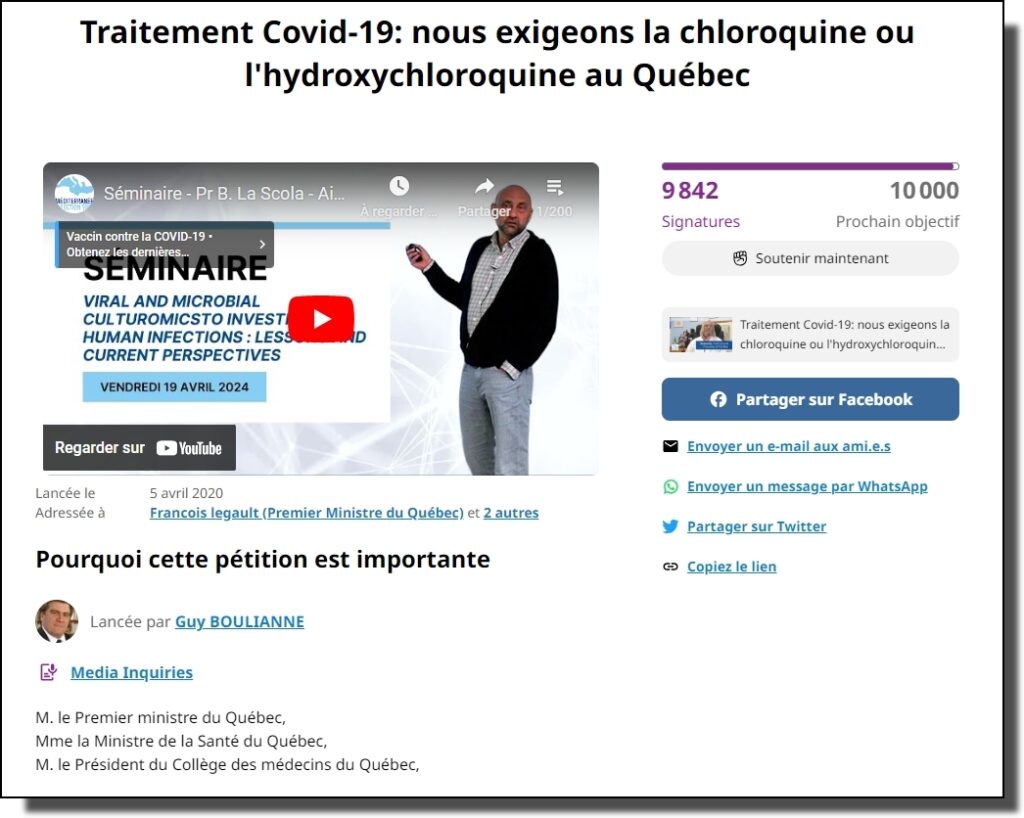 Je vous annonce que je participe officiellement à une action collective contre Meta Platforms Inc., propriétaire de Facebook, pour avoir été censuré, sanctionné et banni de ce réseau social durant ce qu’on appelle la pandémie de COVID-19. Ma participation à cette action a été confirmée par l’avocat William Desrochers lui-même : « Vous faites automatiquement partie du groupe, vous n’avez rien à faire à court-moyen terme. Vous devriez recevoir l’avis adressé à tous les membres dans les prochaines semaines ou prochains mois. Lorsqu’une action sera requise de votre part, vous serez avisé. » Je vous rappelle qu’après douze années de présence assidue sur ce réseau, Facebook avait complètement fermé mon compte le 6 avril 2020 après que j’y aie diffusé une pétition exigeant de la part du Gouvernement du Québec que la chloroquine ou l’hydroxychloroquine soit administrée aux personnes atteintes du COVID-19. Cette pétition avait alors collecté 9 842 signatures. Elle était envoyée directement dans la boîte de réception de François Legault, de Danielle McCann (ministre de la Santé et des Services sociaux) et du Dr Mauril Gaudreault (président du Collège des médecins du Québec).