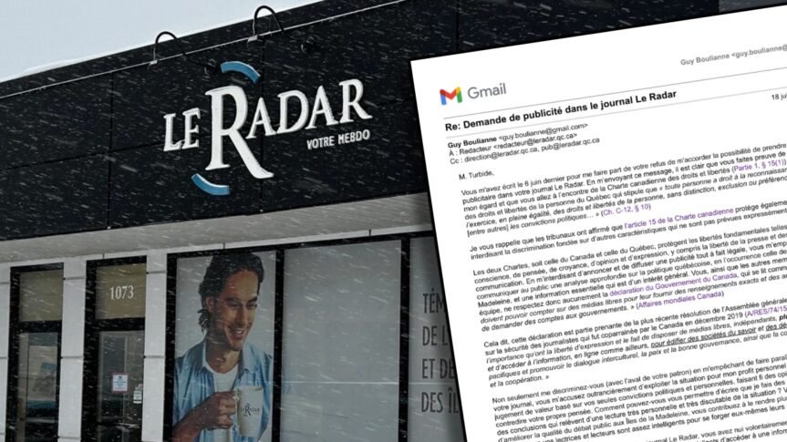 - Le Radar refuse ma publicité. Selon le rédacteur en chef, Raphaël Turbide, au lieu d’améliorer la qualité du débat public aux Îles de la Madeleine, je contribue « à le rendre plus confus ». (sic)
