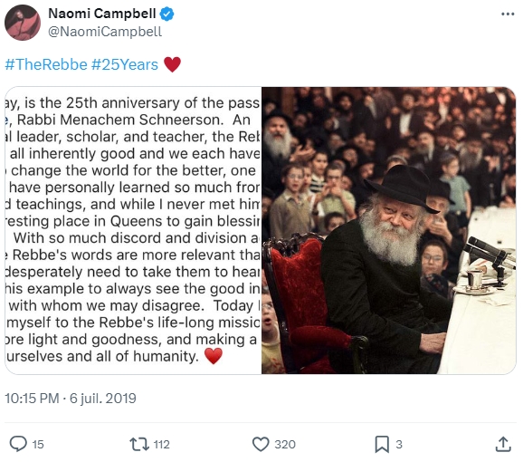 La luciférienne Naomi Campbell rend un vibrant hommage au Rabbin Menachem Schneerson :
