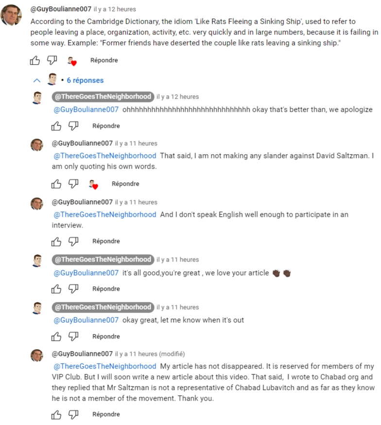 J’ai expliqué à Tony que je n’ai pas du tout calomnié David Saltzman comme il l’a prétendu durant sa vidéo. Je n’ai fait que reprendre et citer ses propres mots… rien de plus ni de moins. J’ai aussi profité de l’occasion pour lui dire que j’avais communiqué avec l’organisation Chabad.org et qu’ils m’avaient répondu que M. Saltzman n’est pas un représentant de Chabad-Loubavitch et qu’à leur connaissance, il n’est pas membre du mouvement. Qui dit vrai maintenant ?! Lorsqu’une émission se présente comme étant une série parodique, il est alors très difficile de distinguer le vrai du faux. Mais sinon, tout est correct. Le segment de l’émission “There Goes The Neighborhood” est très bien. Dans leur ensemble, les commentaires de Tony Peck et Giselle Montenegro sont assez justes et je n’y vois aucune malice. Tony Peck termine la discussion en écrivant sur Youtube : « Tout va bien, tu es génial, on adore ton article ».