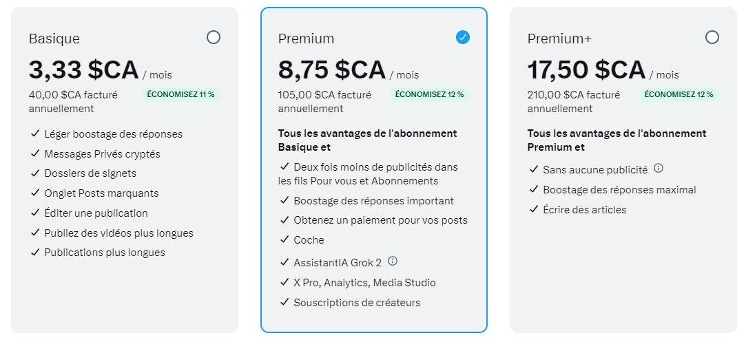 Ci-dessous, les tarifs d’abonnement Premium au réseau ✘/Twitter