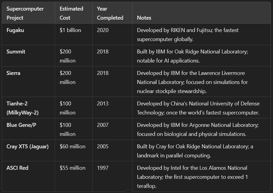 L’opération Stargate, avec son budget estimé à 100 milliards de dollars, constitue un spectacle inquiétant dans le domaine des supercalculateurs. Ce chiffre éclipse les investissements historiques dans les supercalculateurs, tels que Fugaku et Summit, qui ont été financés respectivement à hauteur d’environ 1 milliard et 200 millions de dollars. L’ampleur de Stargate soulève des questions sur les véritables intentions derrière un projet aussi ambitieux, en particulier compte tenu de l’intégration attendue de technologies avancées comme l’informatique quantique et l’IA.