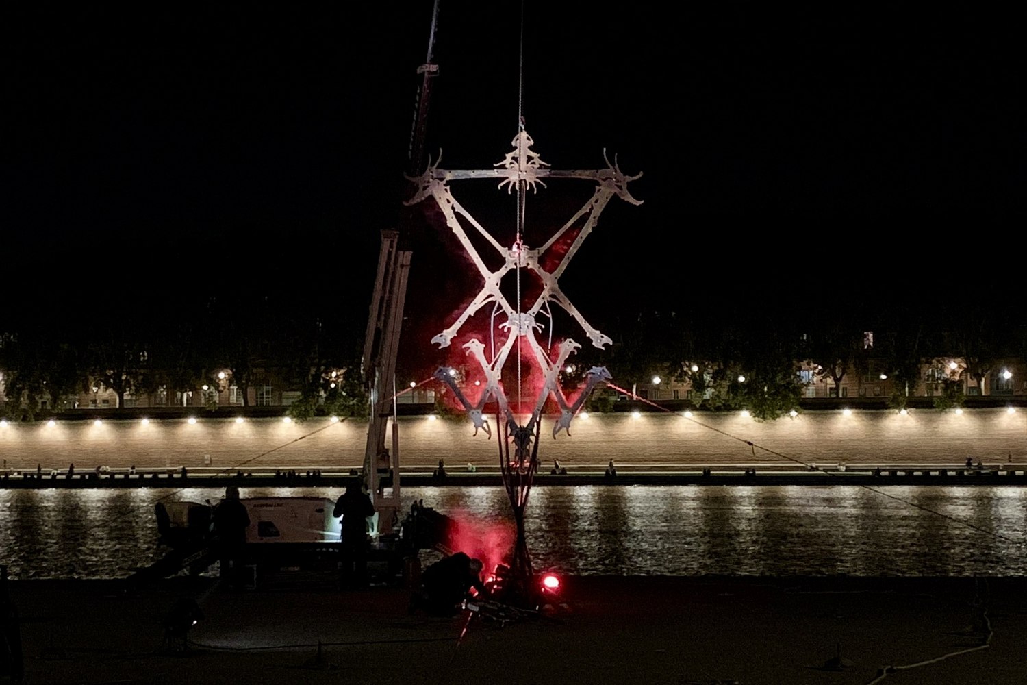 Les premiers éléments que nous avons vu apparaître sur les rives de la Garonne, avant même le début du spectacle, ce sont trois symboles pour le moins ténébreux, soit : la croix de Satan, le sigil de Lucifer et le signe de la bête. Mais ceci n’était pas réellement une surprise puisque tout était déjà annoncé à la sixième page du livret officiel de l’opéra urbain, publié sur le site internet de La Machine : « Des eaux du fleuve, apparaissent les signes prophétiques et prodigieux. (…) Trois signes prodigieux, la croix de Satan, le Sigil de Lucifer et le signe de la bête sont apparus sur les rives du fleuve. Ils sont les clés de La Porte des Ténèbres ». L’archevêque de Toulouse déplorait : « On ne peut pas jouer impunément avec une symbolique satanique. C’est dommage d’imposer un spectacle ténébreux dans la ville de Toulouse ». Marc Baudriller écrit : « De l’art, vraiment ? Le même livret laisse, en tout cas, peu de doutes sur l’univers de cette “distraction”. » Pour ma part, voici ce que j’écrivais dans un article publié le 12 octobre 2024 :