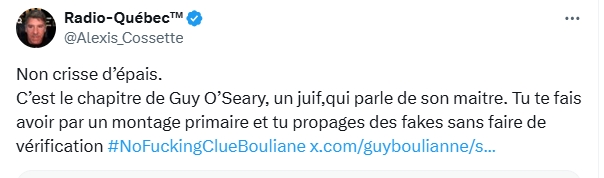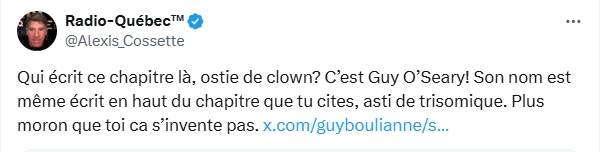 Contrairement aux articles élaborés et sourcés que je publie généralement sur mon site web, c’est ce que j’aime le moins des réseaux sociaux. La rapidité des informations qui y sont diffusées fait en sorte que l’on peut soi-même tomber dans le piège d’un défaut de vigilance. Il ne s’agit donc pas du partage d’une “fake news”, mais d’une simple erreur comme tout le monde peut en faire. Or, Alexis Cossette-Trudel a profité de cette petite erreur pour m’injurier sur le réseau X. Il a utilisé un jargon québécois de très bas étage pour m’insulter et me calomnier comme si j’avais commis le crime du siècle. Celui-ci me qualifie d’« ostie de clown », de « trisomique », de « crisse d’épais », d’« espèce de schtroumpf ». Il ajoute ensuite : « Plus moron que toi ca s’invente pas ». On voit que le bonhomme n’a aucune classe.