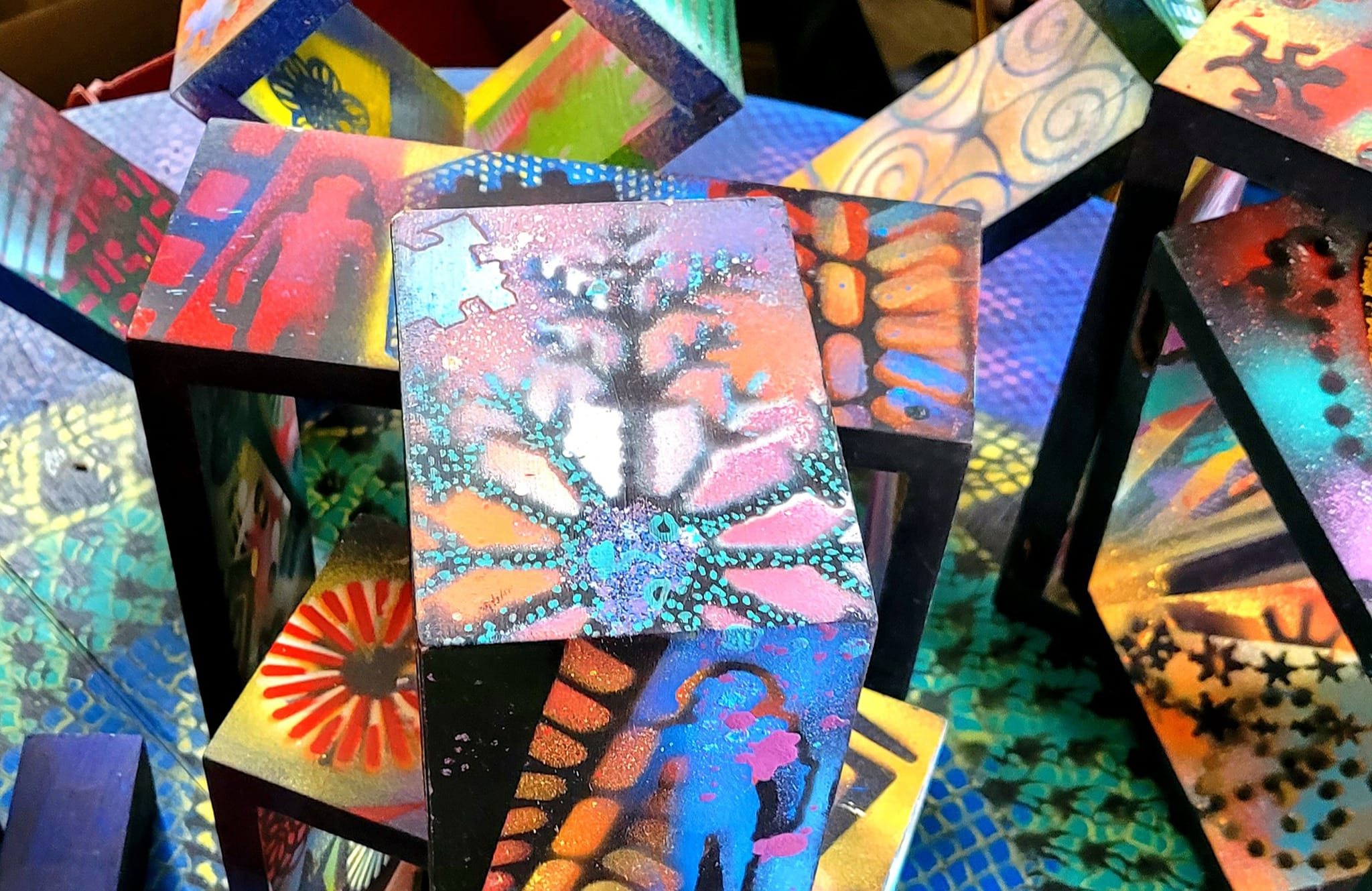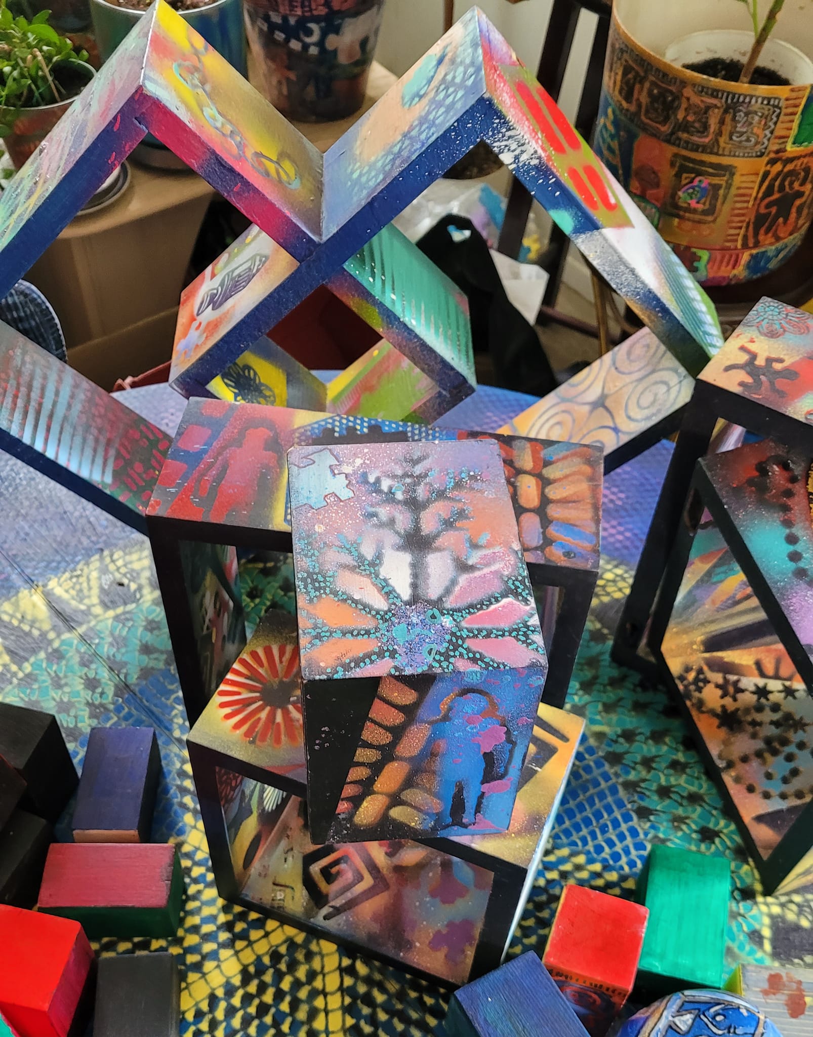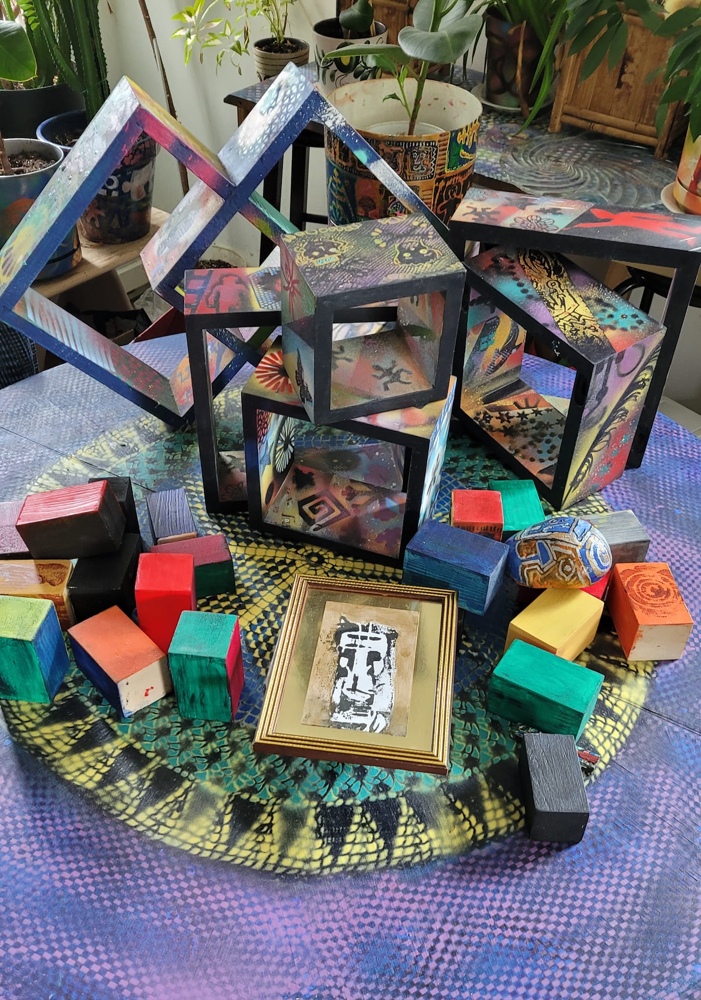 « Je suis alors dans un état où rien n’existe, à part ce que je fais. C’est comme si j’étais plogué avec l’univers, confie Daniel T. Tremblay. Je trouve que travailler sur des objets me donne de la liberté. J’improvise et j’ai suffisamment d’expérience pour que ça marche du premier coup. Je peux aussi m’arrêter, puis recommencer plus tard. » Des bouts de planche, des pots de fleurs, des bottes de marche ainsi qu’un téléphone et un parapluie ont bénéficié de ce traitement. Dans un avenir rapproché, le même sort attend une structure formée de deux carrés de bois imbriqués. Rien qu’en les regardant, en effet, l’imagination du peintre est stimulée. « C’est très géométrique. Il y a huit faces qu’on peut exploiter. Ça va être capoté », lance-t-il avec enthousiasme.