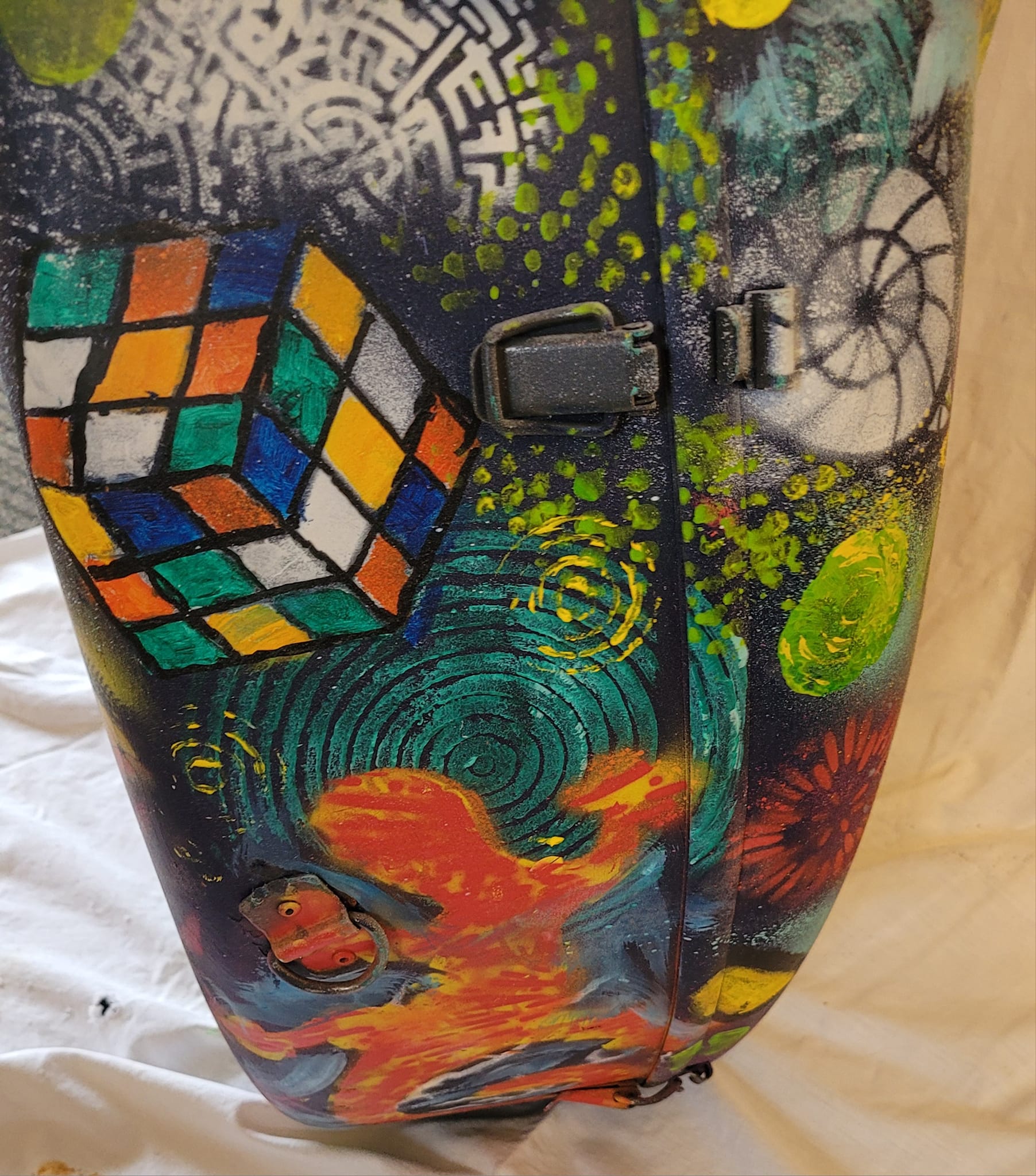 Ils ont en partage des motifs réalisés à la peinture aérosol, un matériau que l’artiste n’utilise jamais dans son appartement. « Le spray, ça se fait dans l’atelier, parce que c’est dehors, que c’est moins nocif pour la santé », explique-t-il. Voyant un tableau fixé en permanence à l’arrière de la maison, le voici qui évoque le souvenir de Jean-Paul Riopelle. « Cette œuvre date de 2002 et je l’ai produite quand il est mort. Lui aussi, il faisait du spray. C’est plus tard que j’ai réalisé que nous avions commencé ça en même temps. Je n’étais pas au courant qu’il s’intéressait à ça. Il y en a beaucoup dans L’hommage à Rosa Luxembourg », note le Chicoutimien en référant à l’ultime chef-d’œuvre du maître.