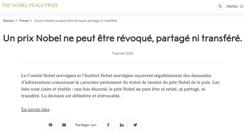 Jeudi, le Centre Nobel de la paix a publié un article qui portait ostensiblement sur les 120 ans d’histoire de la médaille, mais qui a été largement interprété comme faisant également référence à l’actualité. Accompagnant une photo de la médaille portant le portrait d’Alfred Nobel et un symbole de fraternité au revers, la publication précisait qu’il s’agissait d’un modèle inchangé depuis 120 ans. « Saviez-vous que certaines médailles du prix Nobel de la paix ont été transmises après la remise du prix ? », poursuivait la légende, mentionnant Dmitry Muratov, un journaliste russe qui a cofondé un journal pro-démocratie et a vendu aux enchères sa médaille pour plus de 100 millions de dollars « afin de soutenir les réfugiés de la guerre en Ukraine », et Christian Lous Lange, le premier lauréat norvégien, qui a prêté sa médaille pour qu’elle soit exposée au Centre Nobel de la paix. « Mais une vérité demeure. Comme l’affirme le Comité Nobel norvégien : “Une fois qu’un prix Nobel est annoncé, il ne peut être révoqué, partagé ni transféré. La décision est définitive et sans appel.” » Le message concluait ainsi : « Une médaille peut changer de propriétaire, mais le titre de lauréat du prix Nobel de la paix, lui, ne peut pas. »