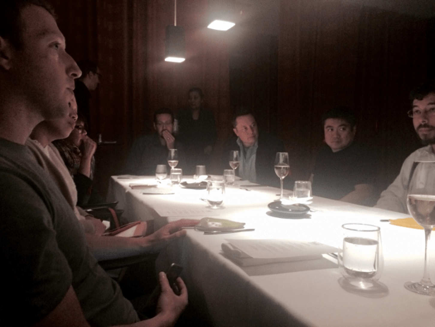 Epstein écrivit à Peter Attia la veille de la rencontre : « Où es-tu ? Je serai peut-être à Los Angeles lundi, à Burbank pour visiter l’intérieur de l’autre avion, et ce soir dîner avec Musk, Thiel et Zuckerberg. » Après avoir discuté des caractéristiques de la rencontre, Epstein confirma à Attia que le sujet de la rencontre était l’argent. Attia répondit : « Je vois… ils en ont besoin de plus ? » Epstein écrivit ironiquement : « Ils doivent apprendre à le dépenser », ce à quoi Attia répondit : « C’est un problème beaucoup plus intéressant, surtout pour Zuckerberg. » (document No. EFTA00689728) Il semble que Gary Winnick aurait aussi participé à cette rencontre. Celui-ci est le fondateur de Global Crossing, une des premières entreprises mondiales de réseaux de fibre optique qui, en 1999, était évaluée à 20 milliards de dollars. Dès le lendemain, Epstein publia une photo de la rencontre sur laquelle on aperçoit très clairement Elon Musk et Mark Zuckerberg (documents No. EFTA01205691 et EFTA01205692).