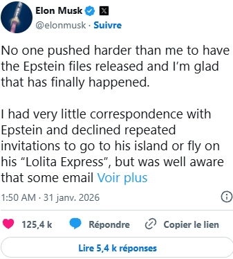 Comme tous les individus de son acabit, Elon Musk mentira et niera toujours les faits et la vérité afin de s’extraire de toute condamnation publique et criminelle. Le 31 janvier 2026, il affirmait dans un message publié sur Twitter/X qu’il avait « eu très peu de correspondance avec Epstein ». Or, ceci est complètement faux. Pour s’en rendre compte, il suffit de consulter le site web jmail.world et de rechercher l’adresse « elon@spacex.com ». On y retrouvera des centaines de courriels échangés entre Epstein et Musk. Jmail est une archive en ligne d’emails publics publiés par la Commission de surveillance et de réforme du gouvernement de la Chambre des représentants des États-Unis en vertu de la loi sur la transparence des dossiers Epstein (EFTA). Le site web présente une interface inspirée de Gmail, afin de faciliter l’accès et la consultation des documents publiés dans le cadre de l’EFTA. Le site propose une vue depuis la boîte de réception personnelle du financier et délinquant sexuel Jeffrey Epstein, jeevacation@gmail.com, et contient des conversations textuelles jusqu’en 2019.