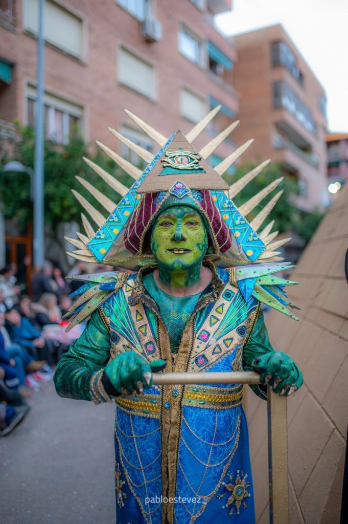 L’horloge sonne midi, signal du départ, mais le défilé commence plus tôt. Les groupes se rassemblent sur l’avenue Entrepuentes et l’atmosphère se pare des préparatifs : costumes ajustés à la dernière minute, maquillage retouché avec précision, percussions tâtonnant – un coup sec, puis un autre, le troisième plus déterminé – et l’on sent que la ville est sur le point de se métamorphoser. Ce n’est pas qu’un simple défilé : c’est une machinerie gigantesque qui se déploie par étapes, avec des gens qui entrent et sortent de scène comme si, pendant quelques heures, Badajoz avait écrit un scénario en paillettes et en rythmes de tambours.