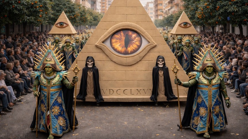 Les « Illuminati reptiliens » de Sinsili-Nó lors du grand défilé du Carnaval de Badajoz, 15-02-2026.