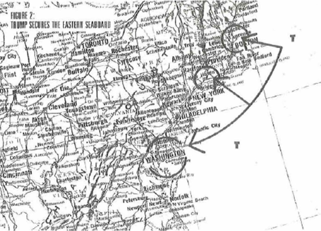 Une fois Gotham et Atlantic City sécurisées, Washington, D.C., déjà plongée dans le chaos, sera une proie facile. Probablement le soir d’un grand combat de Tyson sponsorisé par Trump (afin de détourner l’attention du public), les troupes de Trump se déploient par voie terrestre, maritime et aérienne, tandis que la base de New York assure la protection contre toute intervention du nord et que les flancs sud sont protégés par les importantes installations de Trump à Palm Beach, en Floride – très probablement sous le commandement du maréchal Lacocca.