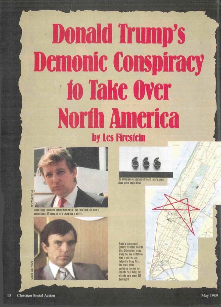 Je vous présente un article visionnaire et incisif du producteur et scénariste, Les Firestein, intitulé : “Donald Trump’s Demonic Conspiracy to Take Over North America” (Le complot démoniaque de Donald Trump pour prendre le contrôle de l’Amérique du Nord). Cet article fut publié une première fois dans le magazine Christian Social Action (mai 1989) et repris quelques mois plus tard dans le magazine National Lampoon (février 1990). Sous le couvert de la parodie et du sarcasme, Les Firestein a prédit en quelque sorte l’ascension de Donald trump jusqu’à la Maison Blanche en usant de toutes sortes de stratagèmes. Les rédacteurs du magazine National Lampoon écrivaient en introduction : « Plus insidieux que la guerre bactériologique ! Aussi abject que Roseanne ! Aussi impitoyable que Barney Clark ! Et tout est là ! Les Firestein, ancien ponte de la Commission Warren, dévoile au grand jour le plan de Donald Trump pour conquérir l’Amérique du Nord. »