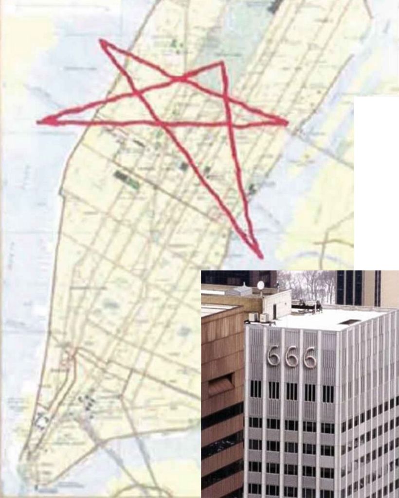 Damien Thorn, du film « La Malédiction », a fréquenté une académie militaire, tout comme Donald Trump. Et Trump a conclu sa première grande affaire en 1976 — l’année même de la sortie du film ! Damien Thorn est pâle, sans humour et arbore une coupe de cheveux affreuse et clairsemée… Faut-il en dire plus ? Je crains de devoir le faire. Si Donald Trump n’est pas le diable, comment expliquer que ses propriétés new-yorkaises forment un pentagramme autour du célèbre gratte-ciel de Manhattan, le 666 Fifth Avenue ? Et pourquoi a-t-il acheté un immense terrain ferroviaire si près de l’hôtel Penta ?