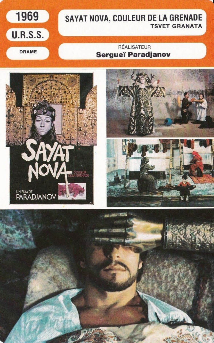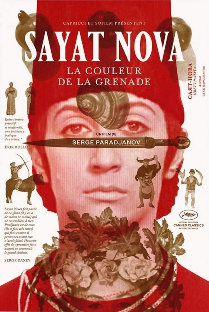 La Couleur de la grenade, initialement connu sous le titre “Sayat Nova” (russe : Цвет граната | arménien : Նռան գույնը), est un film d’avant-garde arménien soviétique de 1969, écrit et réalisé par Sergueï Paradjanov. Le film est une œuvre poétique retraçant la vie du poète et troubadour arménien du XVIIIe siècle, Sayat Nova. Considéré comme un jalon de l’histoire du cinéma, il a été largement salué par les cinéastes et les critiques. Il est souvent considéré comme l’un des plus grands films jamais réalisés.
