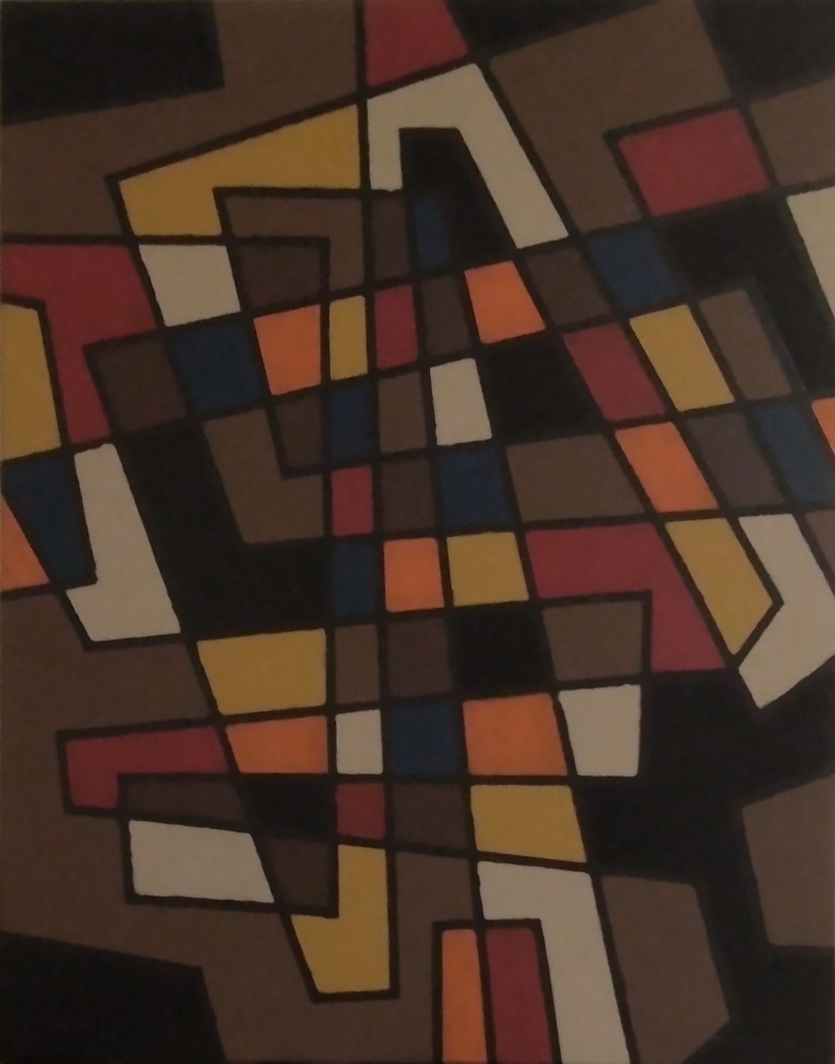 Une œuvre géométrique abstraite et vibrante, présentant une composition complexe de triangles et de polygones interconnectés dans des tons vifs de rouge, de vert et de bleu foncé, soulignés d’épaisses lignes noires créant une structure en toile d’araignée. L’agencement des formes est dynamique, certains triangles se chevauchant et d’autres se croisant à angles vifs, formant une mosaïque complexe sur un fond brun foncé. La composition générale respire l’énergie et le mouvement, rappelant les vitraux ou les influences cubistes, avec une répartition équilibrée des couleurs et des formes qui captive le regard.