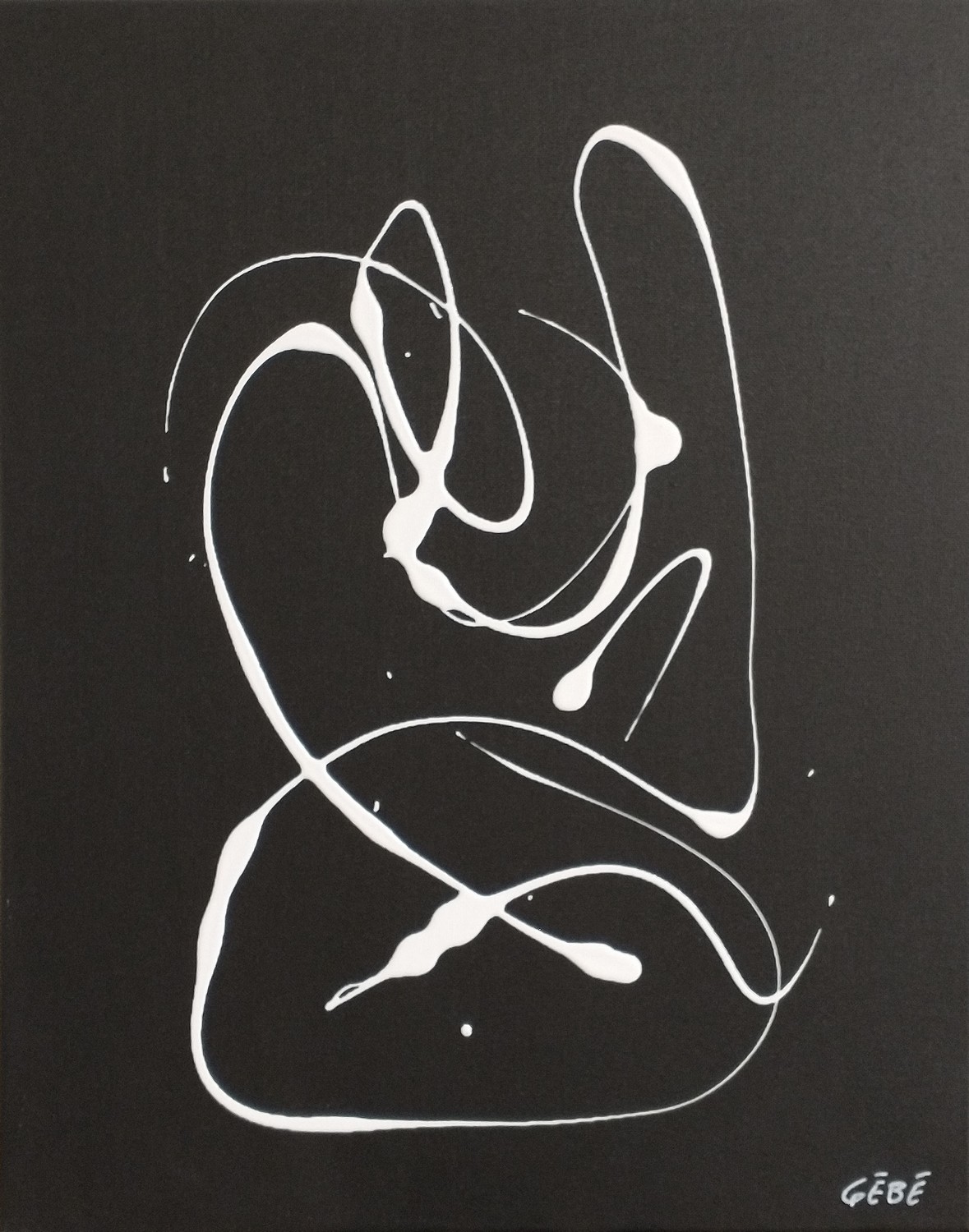 Une peinture abstraite dynamique sur fond noir, parsemée d’éclaboussures et de coulures de peinture blanche fluides et audacieuses, créant des lignes et des boucles dynamiques et entrelacées. La composition, chaotique mais équilibrée, dégage une impression de mouvement et de spontanéité, les différentes épaisseurs de lignes blanches ajoutant profondeur et texture. En bas à droite, la signature de l’artiste, « GÉBÉ », est visible, contrastant subtilement avec le fond sombre. Cette œuvre dégage un style moderne et expressif rappelant l’action painting de Jackson Pollock, soulignant l’émotion brute et la créativité débridée transmises par des éclaboussures et des stries blanches aléatoires sur une toile noire austère.