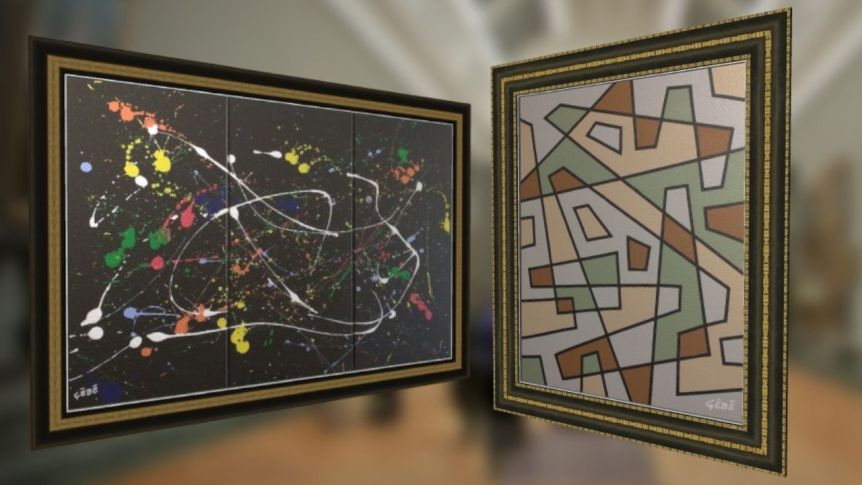 Une peinture abstraite éclaboussée, dynamique et énergique, présente un fond noir baigné d’une explosion de couleurs vibrantes, dont le jaune, le blanc, le rouge, le bleu, le vert et l’orange. Des éclaboussures et des coulures de peinture éclatantes parsèment la toile, créant une impression de mouvement chaotique et de spontanéité. Des éclaboussures et des stries de peinture blanches et colorées s’entrecroisent dans diverses directions, certaines formant des motifs circulaires ou en boucle, tandis que d’autres apparaissent comme des taches irrégulières et de fines lignes. De plus grandes amas de peinture, tels que des éclaboussures jaunes et blanches vives, créent des points focaux, contrastant fortement avec le fond sombre. La composition, vivante et libre, capture une impression de fluidité et d’aléatoire typique de l’expressionnisme abstrait, avec une impression générale d’énergie vibrante et chaotique qui invite le spectateur à interpréter sa propre signification à partir de cette explosion apparemment spontanée de couleurs et de formes. Le coin inférieur gauche porte la signature « GÉBÉ », subtilement intégrée à la composition.
