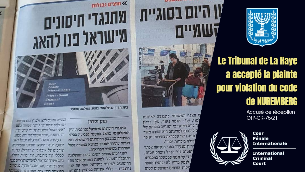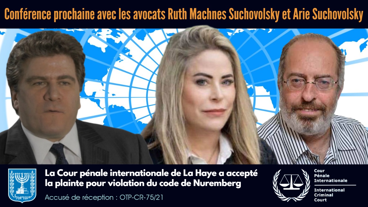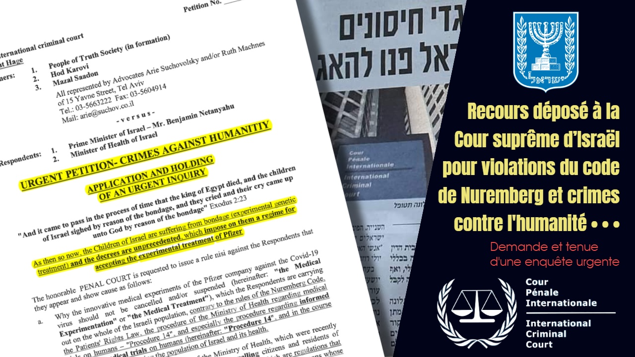 La crise de Coronavirus Le rabbin Amnon Yitzhak et l’auteure juive italienne Paola Fargion défendent le juge Angelo Giorgianni des accusations d’antisémitisme10 avril 2021La Cour européenne des droits de l’homme vient d’ouvrir la porte à la vaccination obligatoire contre le Covid-19 à travers tout le continent10 avril 2021Un autre recours vient d’être déposé à la Cour suprême d’Israël par le Dr Hervé Seligmann et l’ingénieur Haim Yativ contre les vaccins COVID31 mars 2021Michael Yeadon, ancien v-p de Pfizer, dit : « Je suis bien conscient des crimes contre l’humanité perpétrés à l’échelle globale contre une vaste proportion de la population mondiale »31 mars 2021Un groupe de chercheurs intente une action en justice contre le gouvernement norvégien pour crimes contre l’humanité au Tribunal de La Haye29 mars 2021Dr Mark Trozzi : Statistiques sur les décès. En quoi Covid-19 est-elle une « pandémie » ? La réponse vient du roman de 1984 et de l’OMS28 mars 2021Les combats se mènent sur tous les fronts — Le juge italien Angelo Giorgianni a lui aussi déposé une plainte pour « crimes contre l’humanité »27 mars 2021Vincenzo Guzzo, président des cinémas Guzzo, envisage de diffuser le documentaire de Pierre Barnérias, Hold-Up, dans ses salles du Québec27 mars 2021La vidéo censurée de la rédactrice en chef du magazine Wochenblick fait le tour du monde : «La vaccination est la vraie pandémie»27 mars 2021La Commission d’enquête civile située en Israël demande l’arrêt obligatoire de l’administration des vaccins Pfizer en raison de l’absence d’un système de surveillance des effets secondaires26 mars 2021Me Nicolas Turp soutient qu’un article de la Loi sur la santé publique sur l’état d’urgence est inconstitutionnel et donc invalide et inopérant26 mars 2021Me Jean-Félix Racicot : « Nous allons continuer à nous battre car sinon qui le fera. La voix des gens libres doit continuer d’être portée. »25 mars 2021Un recours judiciaire est maintenant déposé devant la Cour pénale internationale de La Haye pour violations du code de Nuremberg et crimes contre l’humanité par le gouvernement israélien23 mars 2021L’association « Gens de Vérité » en Israël demande au Pape François l’ouverture d’une enquête concernant l’accord Pfizer-Netanyahu22 mars 2021Recours déposé à la Cour suprême d’Israël pour violations du code de Nuremberg et crimes contre l’humanité. Tenue d’une enquête urgente22 mars 2021Pour atténuer les doutes sur la justice — Le Tribunal de La Haye ouvre une enquête contre Israël sur des soupçons de crimes de guerre21 mars 2021La plainte devant le Tribunal de La Haye — Entrevue en français avec les avocats Ruth Machnes Suchovolsky et Aryeh Suchowolski20 mars 2021Dr Geert Vanden Bossche, DMV, PhD : « À tous les scientifiques, experts et autorités du monde entier, à l’ensemble de la population mondiale »17 mars 2021La plainte devant le Tribunal de La Haye et le recours devant la Cour suprême d’Israël – J’ai discuté avec Me Ruth Machnes Suchovolsky16 mars 2021Confirmation dans les médias israéliens — Un groupe qui soutient un choix éclairé d’Israël s’est adressé au tribunal pénal de La Haye15 mars 2021Dr Mark Trozzi, le seul médecin honnête et courageux en Ontario qui respecte le serment d’Hippocrate : « Nous sommes manipulés ! »14 mars 2021COVID-19 — Violation du code de Nuremberg : la lettre d’acception du Tribunal de La Haye a été signée par Mark Dillon (Réf.: OTP-CR-75/21)13 mars 2021COVID-19 — La Cour pénale internationale de La Haye a accepté la plainte pour violation du code de Nuremberg par le gouvernement israélien12 mars 2021Vaccin COVID : Le programme de vaccination israélien «Passeport vert» a créé un «apartheid médical», disent des citoyens désemparés12 mars 2021Le collectif de l’EAQ a déposé une Demande pour ordonnances de sauvegarde afin que cessent les mesures imposées par le gouvernement9 mars 2021Le gouverneur du Mississippi, Tate Reeves, met fin à l’obligation du masque et aux restrictions COVID dans les entreprises et les restaurants3 mars 2021BONNE NOUVELLE — Le gouverneur républicain et catholique, Greg Abbott, met fin au mandat du masque COVID-19 et ouvre le Texas à 100%2 mars 2021Séquestration et extorsion criminelles — Le journaliste de Rebel News, Keean Bexte, est dans une prison canadienne COVID illégale2 mars 2021COVID-19 — Le Centre de justice pour les libertés constitutionnelles intente deux actions en justice devant la Cour fédérale du Canada27 février 2021Demander au gouvernement ou aux tribunaux ne permettra jamais d’obtenir la liberté: seule la désobéissance massive peut prévaloir25 février 2021«‹5678910111213›»