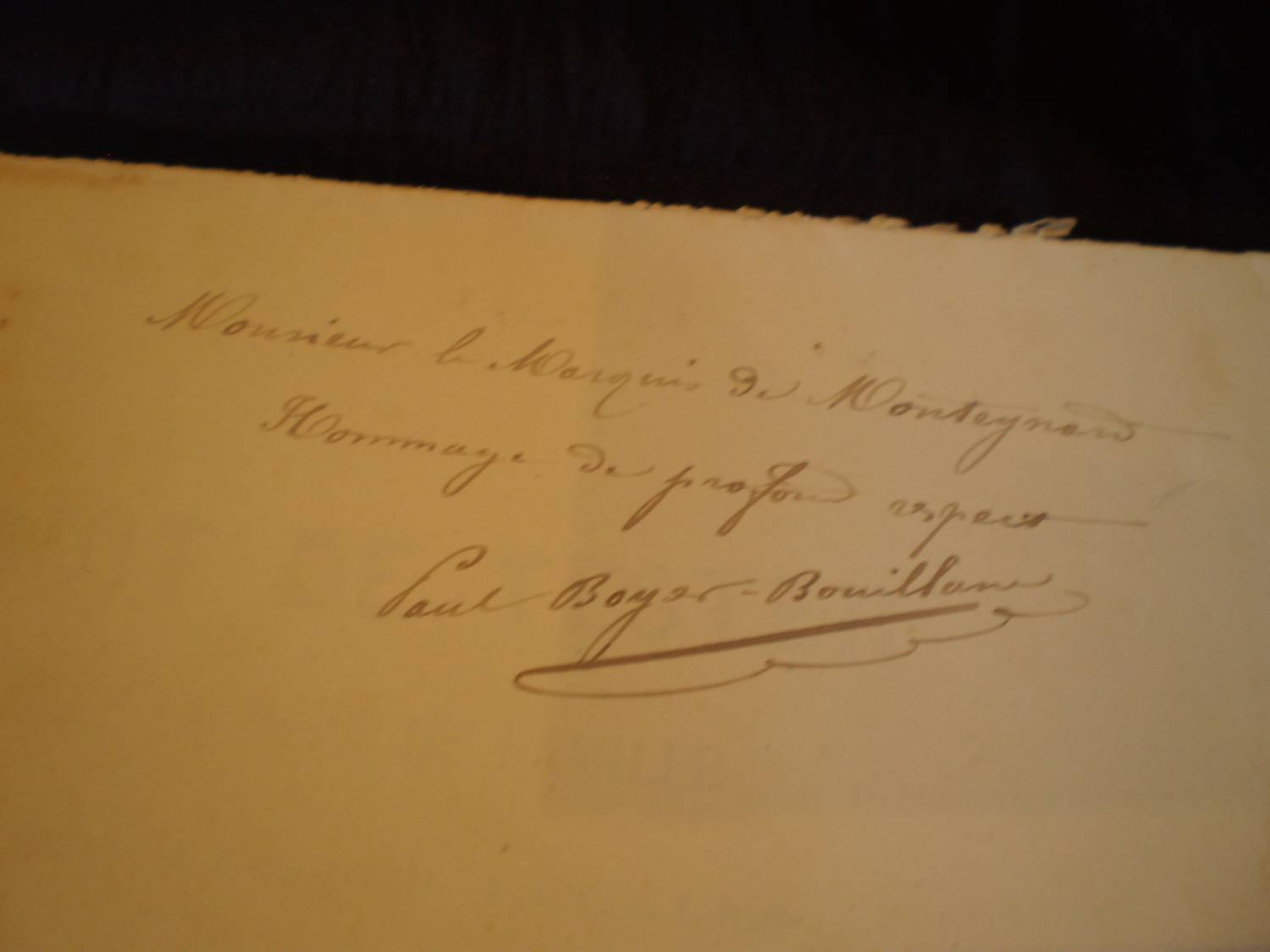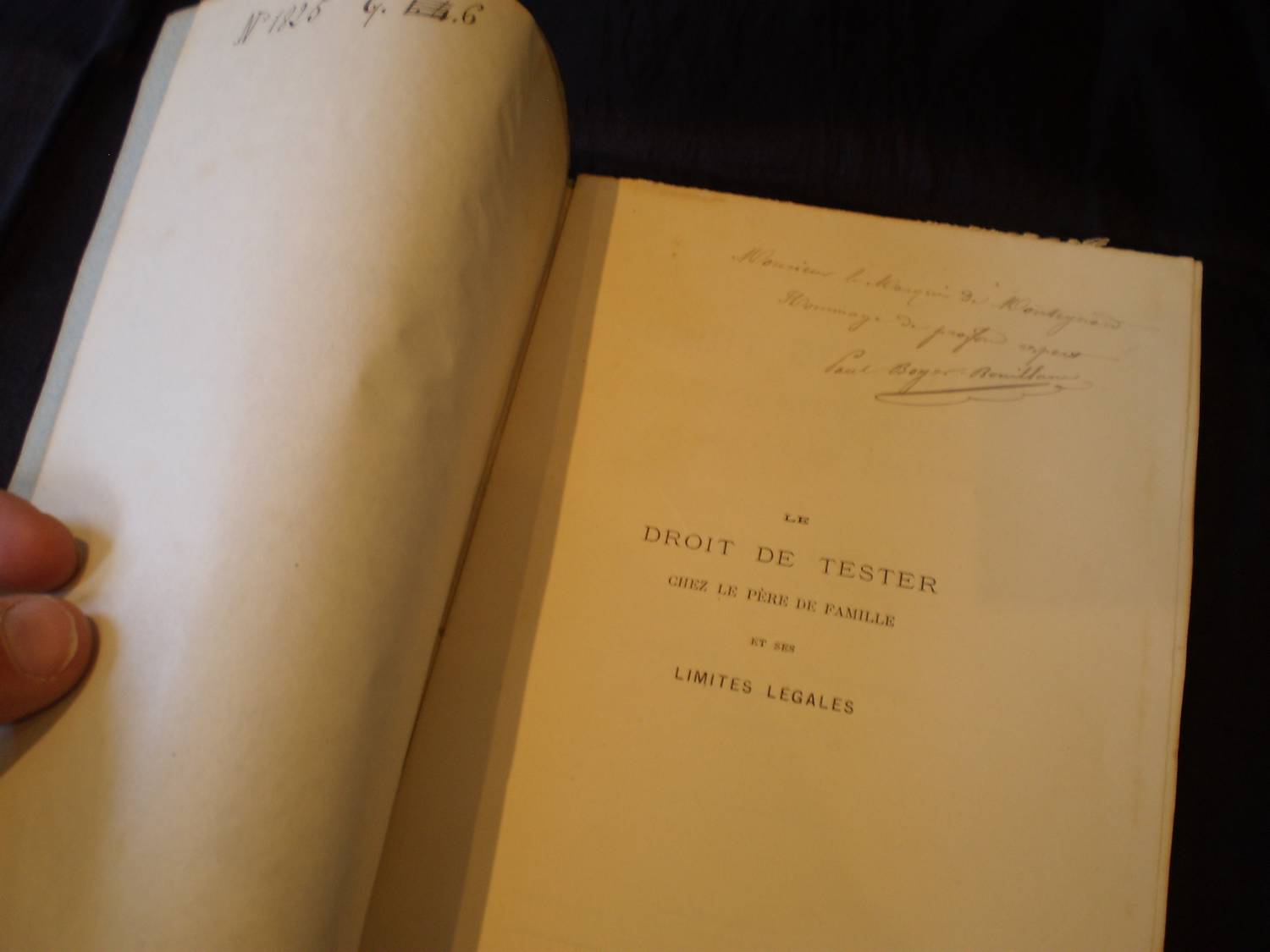 Je suis fier d’avoir fait l’acquisition de deux documents importants au niveau historique. Tout d’abord le livre acheté à la librairie Les Livres du Pont-Neuf à Romainville, intitulé « Le droit de tester chez le père de famille et ses limites légales », écrit par mon arrière-arrière-arrière-grand-cousin au douzième degré, Pierre Paul Henri Dominique Boyer de Bouillane. Ce livre est extrêmement rare à trouver. Il provient d’une lecture faite à la séance de rentrée de la Conférence des Avocats le 20 décembre 1872.