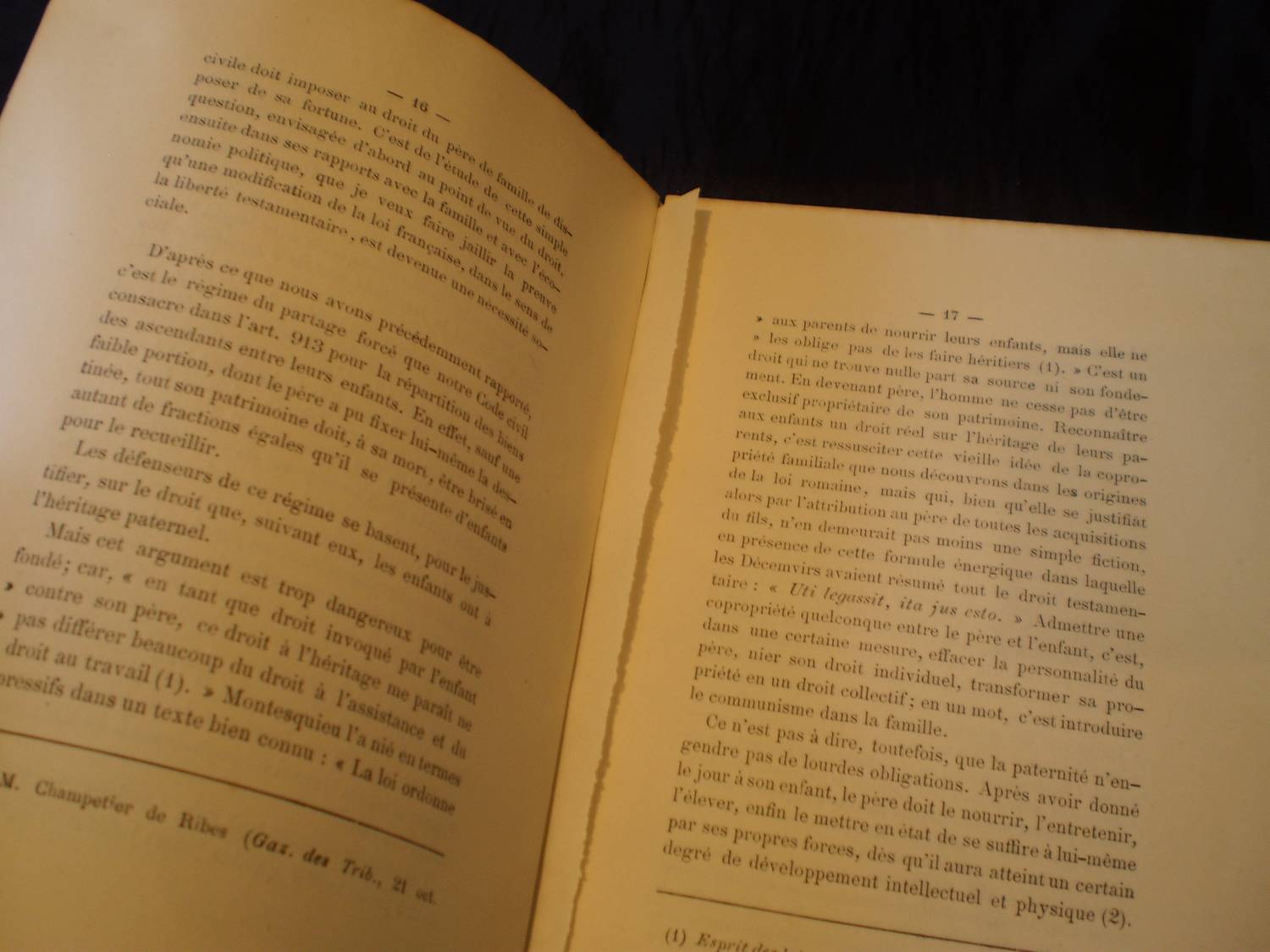 Le droit de tester chez le père de famille et ses limites légalesCette brochure in-8 de 52 pages a été publiée l’année suivante par Rigaudin et Lassagne, à Grenoble. Un peu frottée, avec une étiquette de référencement sur le dos et une usure d’usage, le livre est en bon état général. L’exemplaire que j’ai en main est dédicacé par l’auteur au Marquis de Monteynard.