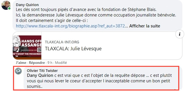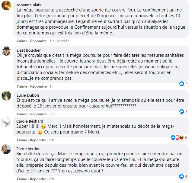 Cette demande en justice a été financée par la Fondation pour la défense des droits et libertés du peuple (FDDLP), une association fondée par le comptable agréé Stéphane Blais. Le 22 janvier, Blais avait annoncé pompeusement sur la page Facebook de l’association un « Coup de canon judiciaire » (à partir de 8:54 minutes). Tout le monde s’attendait donc à la « MEGA poursuite » qu’il promet de déposer depuis le mois de juillet 2020 mais qui n’arrive jamais telle qu’impatiemment attendue. Cela a provoqué — avec raison — de la colère et du mécontentement chez plusieurs personnes. Il est alors indécent de la part de la FDDLP de chercher à dénigrer et à insulter ces individus puisque leur déception, leur incompréhension et leurs questionnements sont tout-à-fait légitimes.