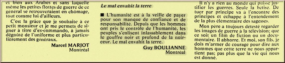 Grâce à la Bibliothèque et Archives nationales du Québec, j’ai retrouvé un document que j’avais perdu et complètement oublié. Il s’agit d’un court texte qui fut publié le 18 janvier 1991 dans La Presse, en opposition au conflit dans le golfe Persique :