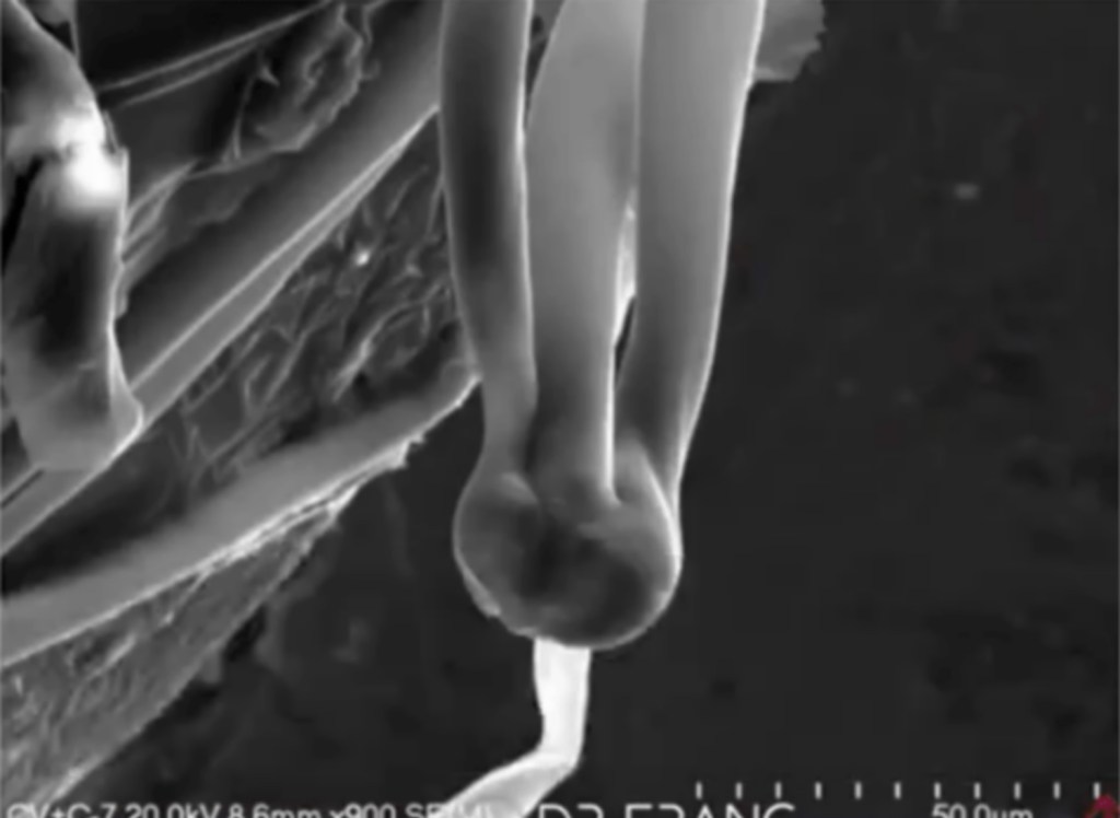 Pourquoi la brosse écouvillon est-elle construite comme ça ? Chaque fin est fondue/scellée. Ce n’est pas coupé, c’est fondu. J’ai analysé les extrémités, ainsi que les parois latérales. Ici, nous avons la paroi latérale, et voici l’extrémité fondue. La brosse-tige contient du titane, de l’aluminium et du carbone.