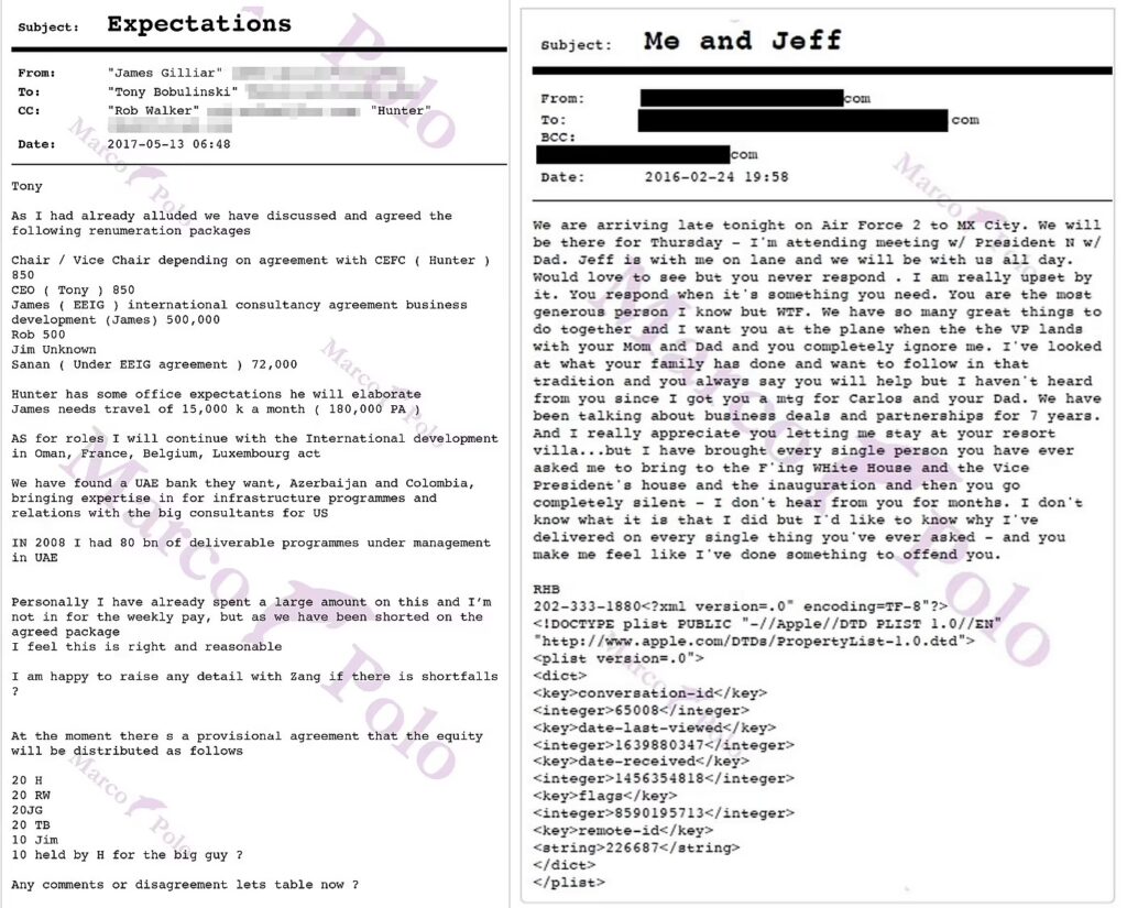 Certains messages ne semblaient pas être inclus dans la base de données. Un e-mail publié par DailyMail.com montre Hunter invitant ses partenaires commerciaux et associés étrangers à un dîner en 2015 au restaurant Café Milano de Washington DC.